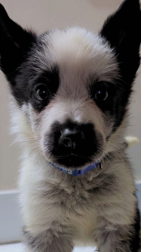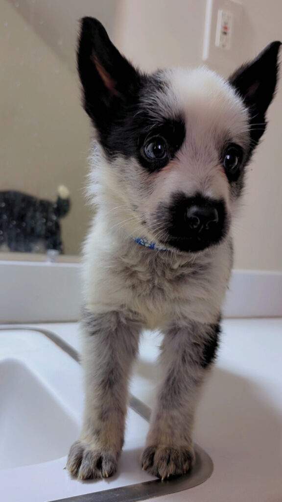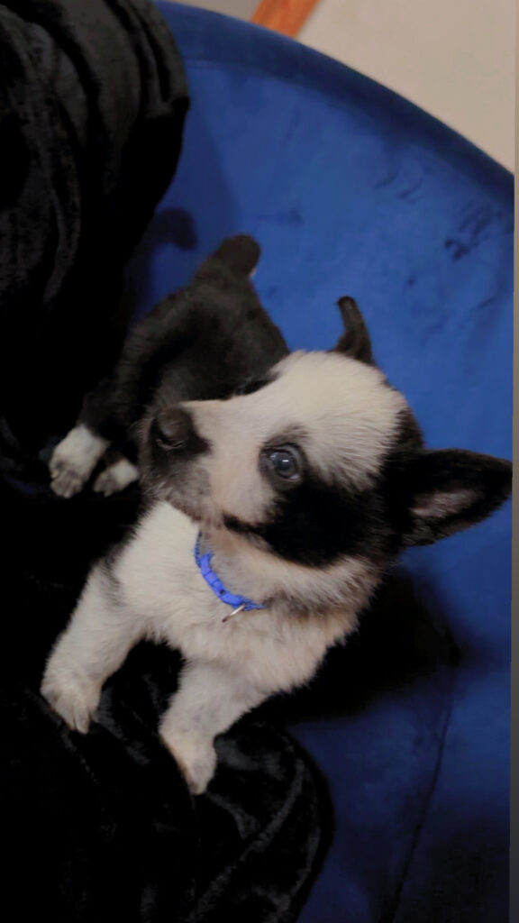Frost will come with his gift basket with his toys and his blanket and his vaccination paperwork as well.