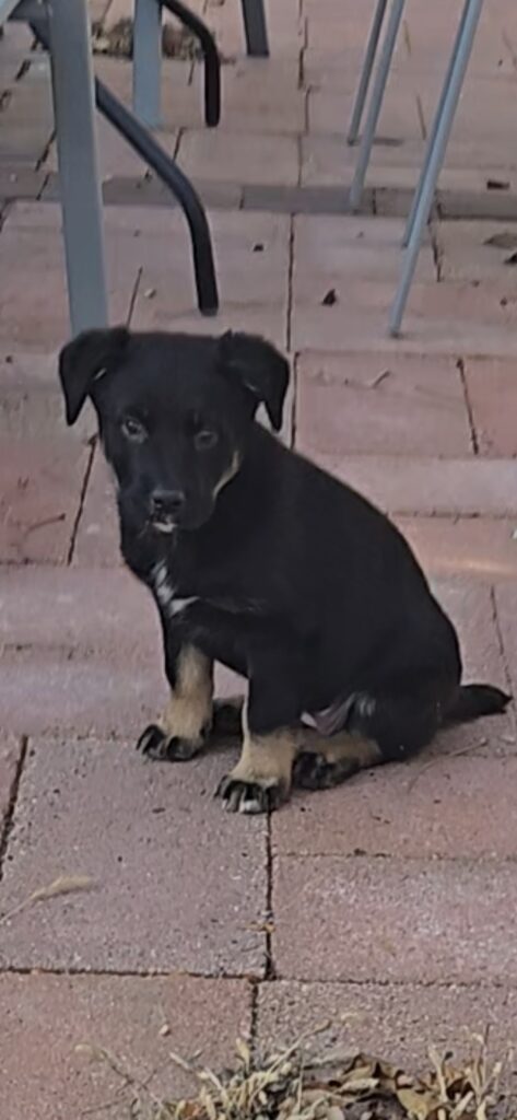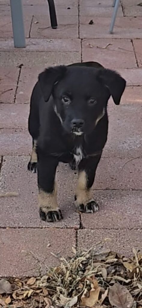 Black w/ brown paws and white patches on chin and chest
