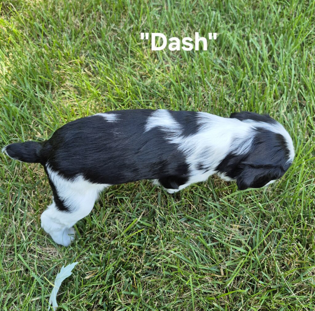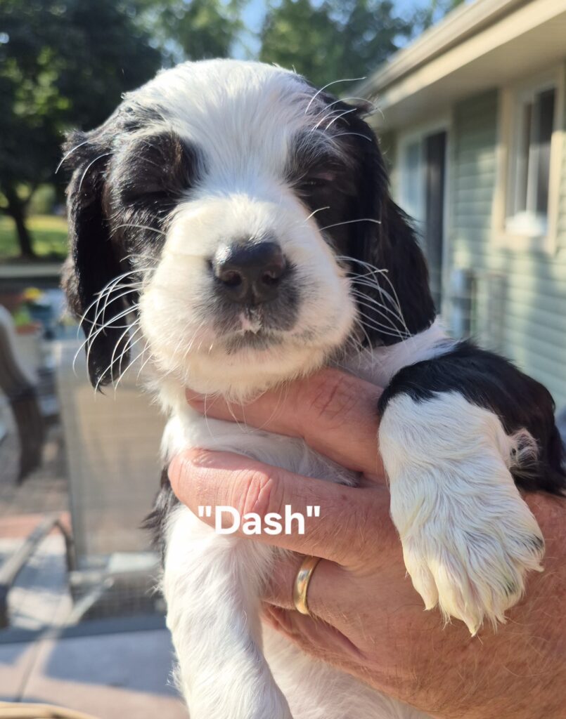 Dash is the only boy in our litter of six! But don’t feel sorry for him because he has the biggest puppy brawl growl! He thinks he is fierce! Dash is one of our darker pups, mostly black with a large white patch on his head. He is going to be curly-haired! He is named Dash because of the — marking on his side!