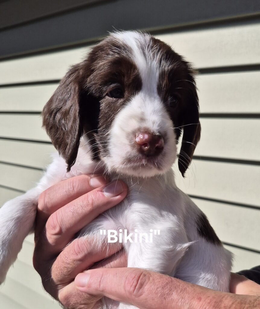 Bikini has two big brown circles on her back and a little triangle brown patch on her tush! Hence, the name Bikini! Bikini is the alpha female. She is one of the biggest pups in the litter and she likes to throw around her weight. She is also very inquisitive and fearless and loves water! She is also real lover!