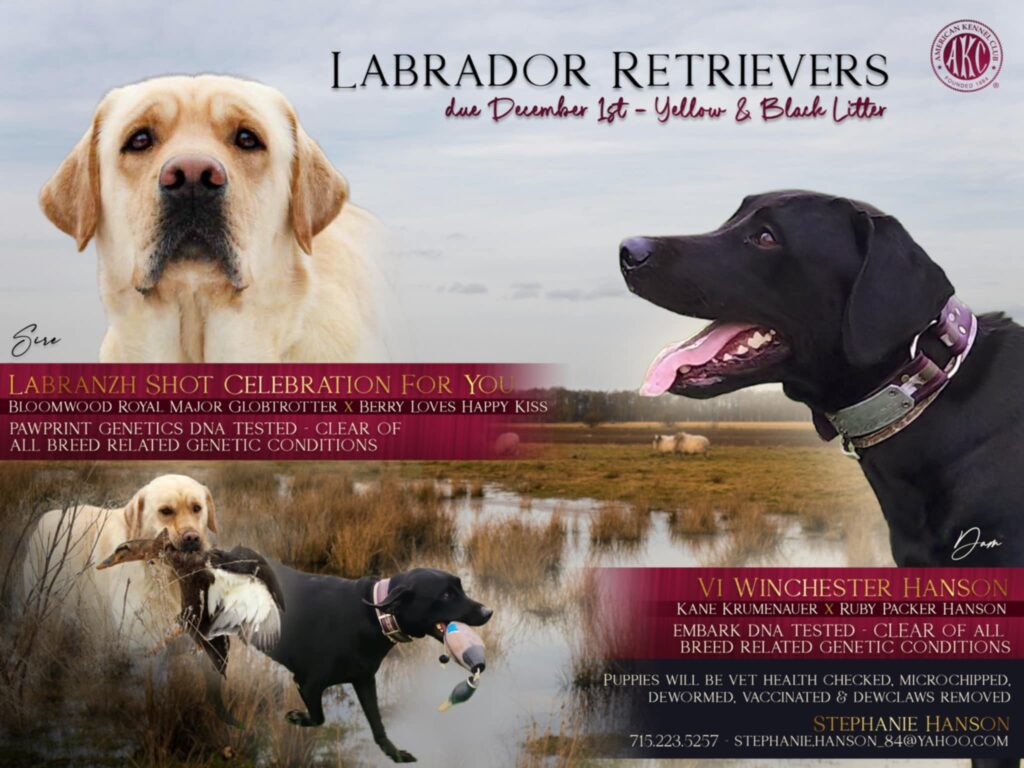 Both parents are health tested clear of all genetic breed related diseases. The father has had, hips, elbows, eyes and cardiac testing done and passed with flying colors. He’s out of Mahner’s Labradors in Tomahawk. The pups will have all age appropriate vaccines, dewormed every two weeks, vet health checked at 6 weeks of age, microchipped, dew claws removed and AKC certified etc. I raise the puppies in my home, they will be around Children, other animals and people. I’m asking for a $100 deposit to hold your puppy. The order I receive deposits will determine the picking order of the puppies. I’m asking for $1,000 for the puppy. I have male and female puppies available in both black and light cream/yellow. Let me know if you have any other questions.