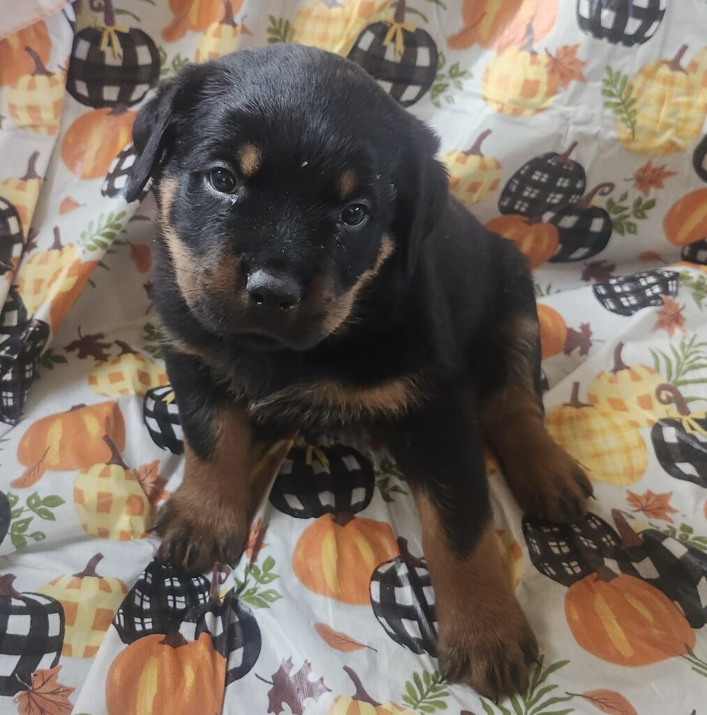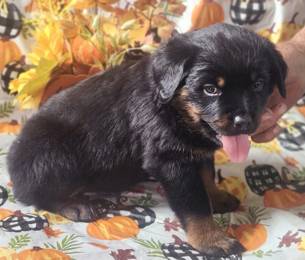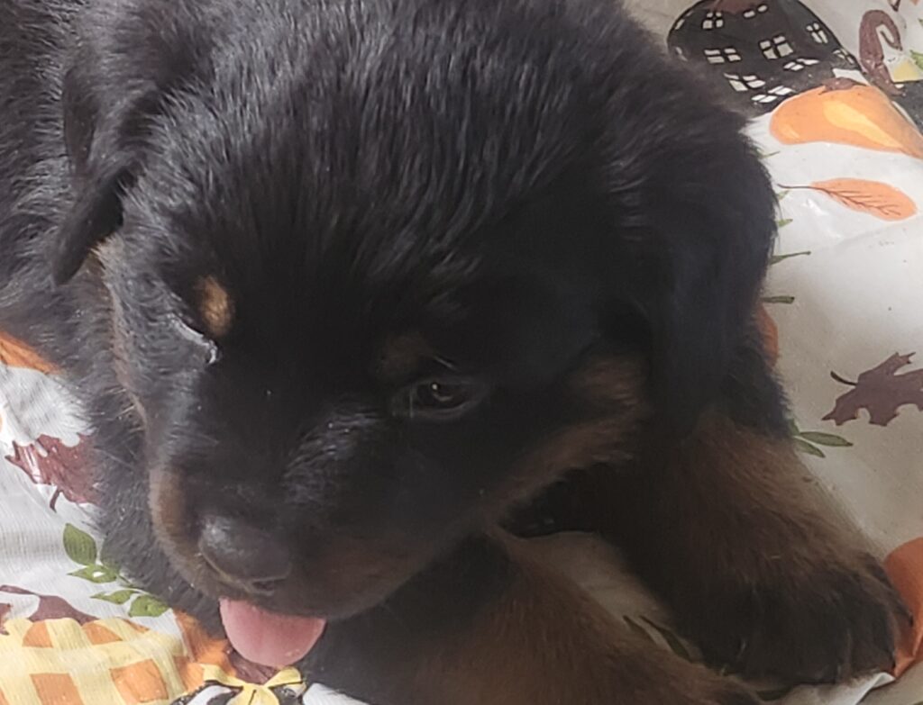 Onyx is a beautiful male with a sweet personality.  He is healthy and well-socialized.  There are a total of 11 puppies in this litter.  Sire and Dam are both AKC registered and Sire has European pedigree.  Onyx is current on vaccines and deworming. He is pad-trained and eats dry puppy chow.  His tail is docked and front dewclaws have been removed. Pictures do not do him justice.  He is beautiful.  Parents are both gentle-natured and have good dispositions. We are happy to provide more pictures or videos of him and/or his parents upon request.