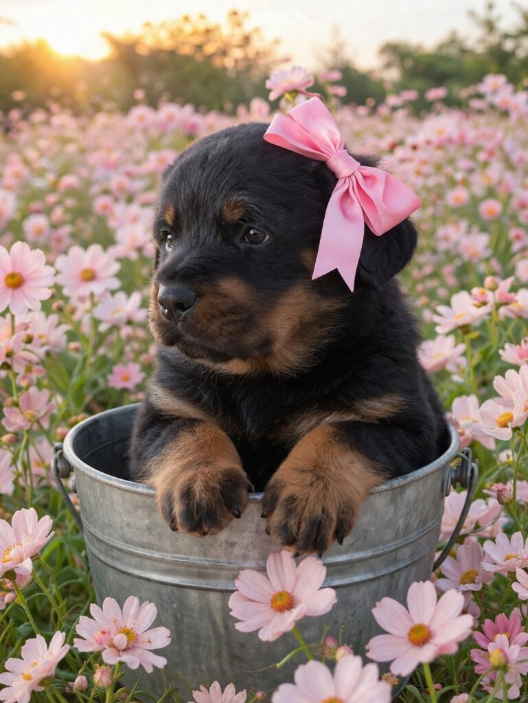 The dam and sire have good non-aggressive temperaments. The sire has a European pedigree and the shorter snout the Euros are known for. Our dogs are known for their exceptional shiny coats. The dam has the longer Rottie fur with waves along the back, which everyone finds striking.