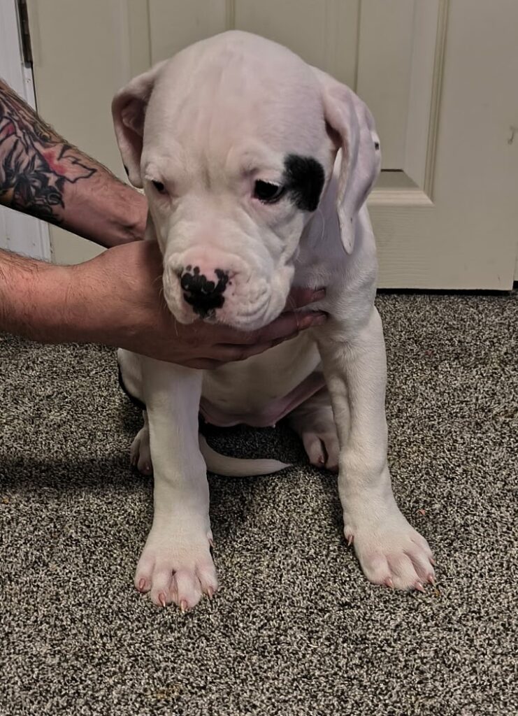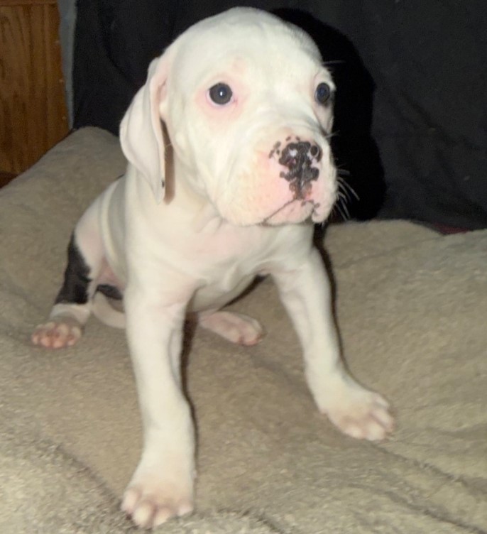 Beautiful mostly white female. Has some black spots. Loves playing with toys and being cuddled. Enjoys being outside.