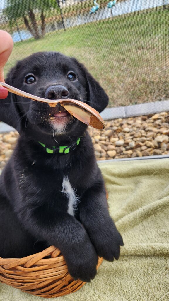 Jasper is a healthy boy and is the 2nd heaviest out of the litter. He is up to date with vaccinations and deworming. He’s eating dry and wet puppy food and loves to play with his siblings. Very sweet and lazy…loves to cuddle. Mom is a black labradoodle (50lbs) and dad is an Australian Shepherd (25lbs).