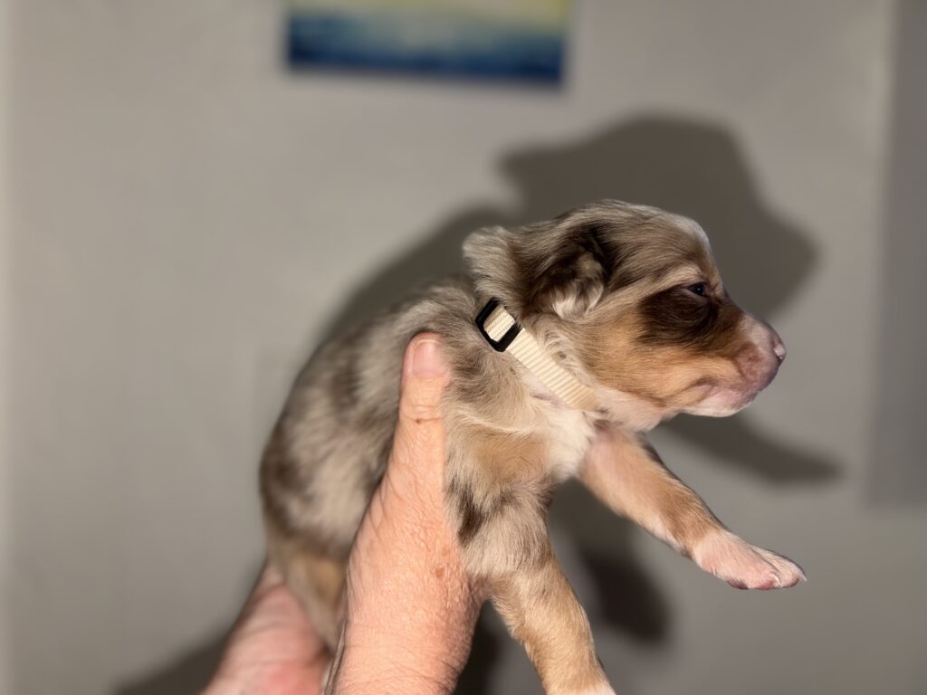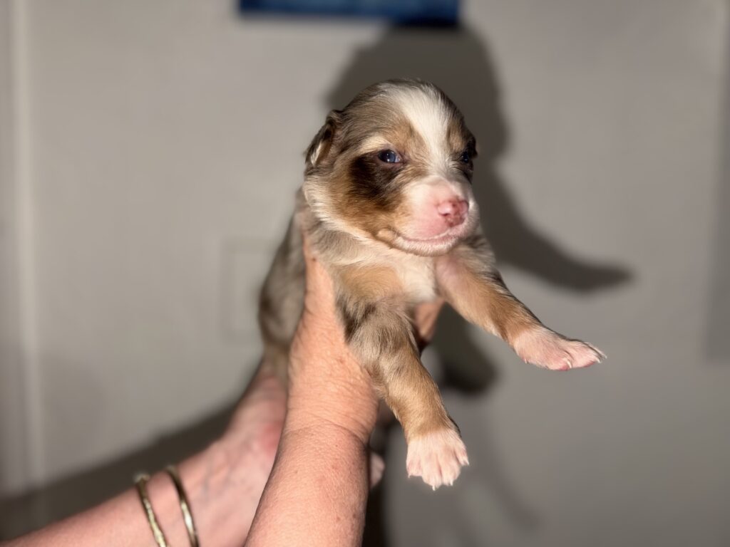 Hi, we’re Oakley and Dahlia, we just had our first ever litter! Oakley the dad is a seven year old red merle with dual colored eyes, one blue and the other one tan/light brown. He’s sired two other litters in the past. He has an extremely lovable and goofy disposition. He loves playing fetch and cuddling. While he does come from a registered bloodline, he does not have registry paperwork. Dahlia the mother is a three year old red tri. She’s always alert and watchful and can always be found sitting or laying looking out a window or door when she isn’t following me around watching her dad’s back. She’s very athletic and also loves fetch. Dahlia is CKC registered with papers. They’re both very family oriented, healthy, up to date on their shots and fed a grain free diet and raised as indoor, family dogs. All puppies will come with a certificate of health and shot records. Individual listings for each puppy will be posted tomorrow. More photos will be made available as they grow and on request. Deposit: $350