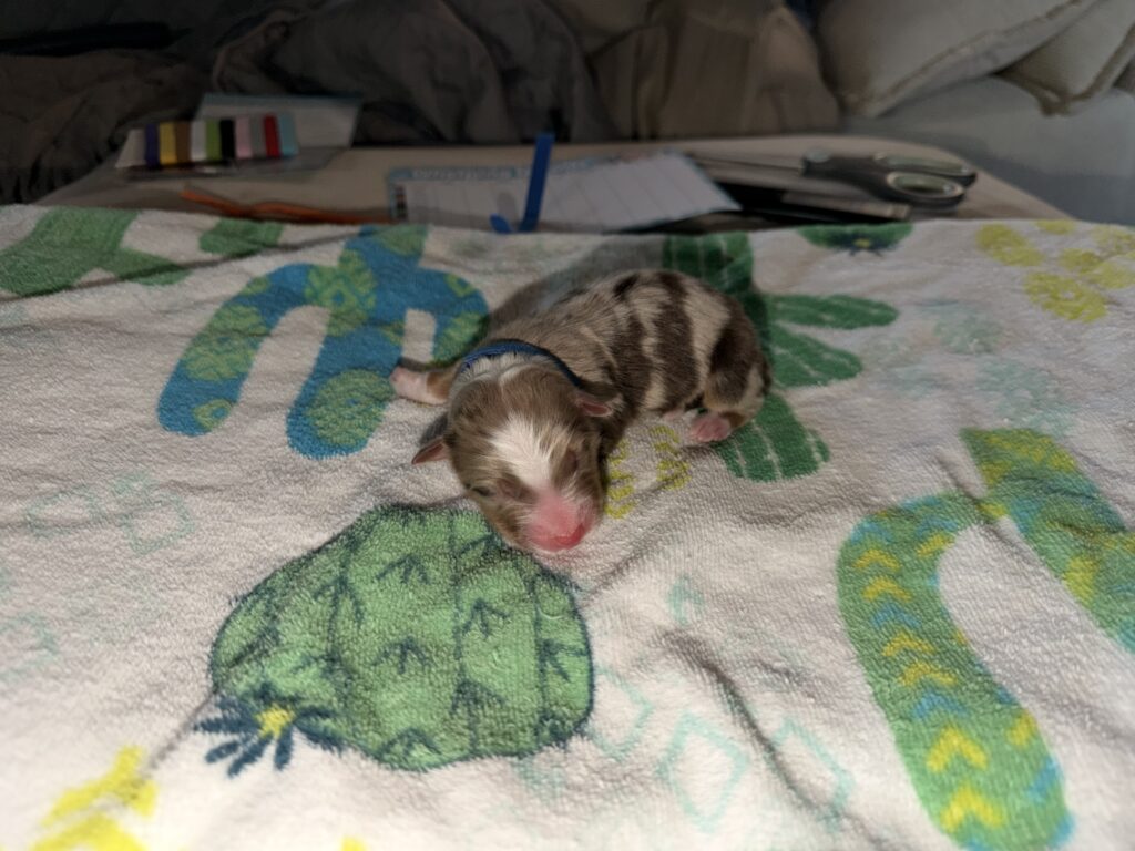 Hi, we’re Oakley and Dahlia, we just had our first ever litter! Oakley the dad is a seven year old red merle with dual colored eyes, one blue and the other one tan/light brown. He’s sired two other litters in the past.