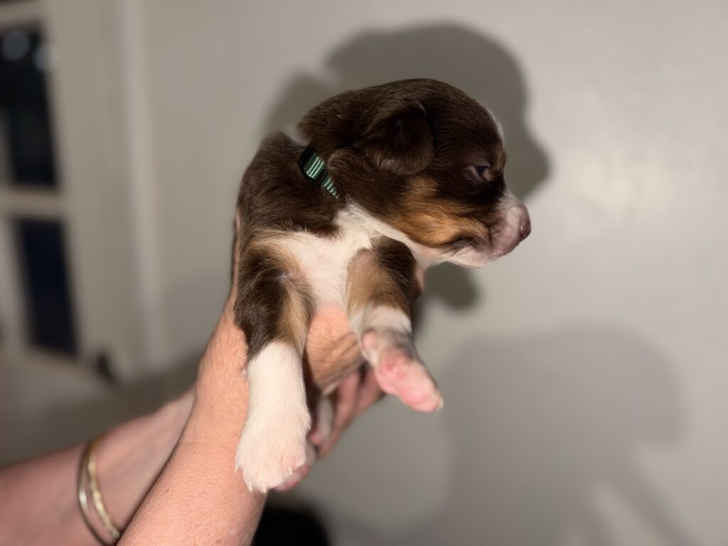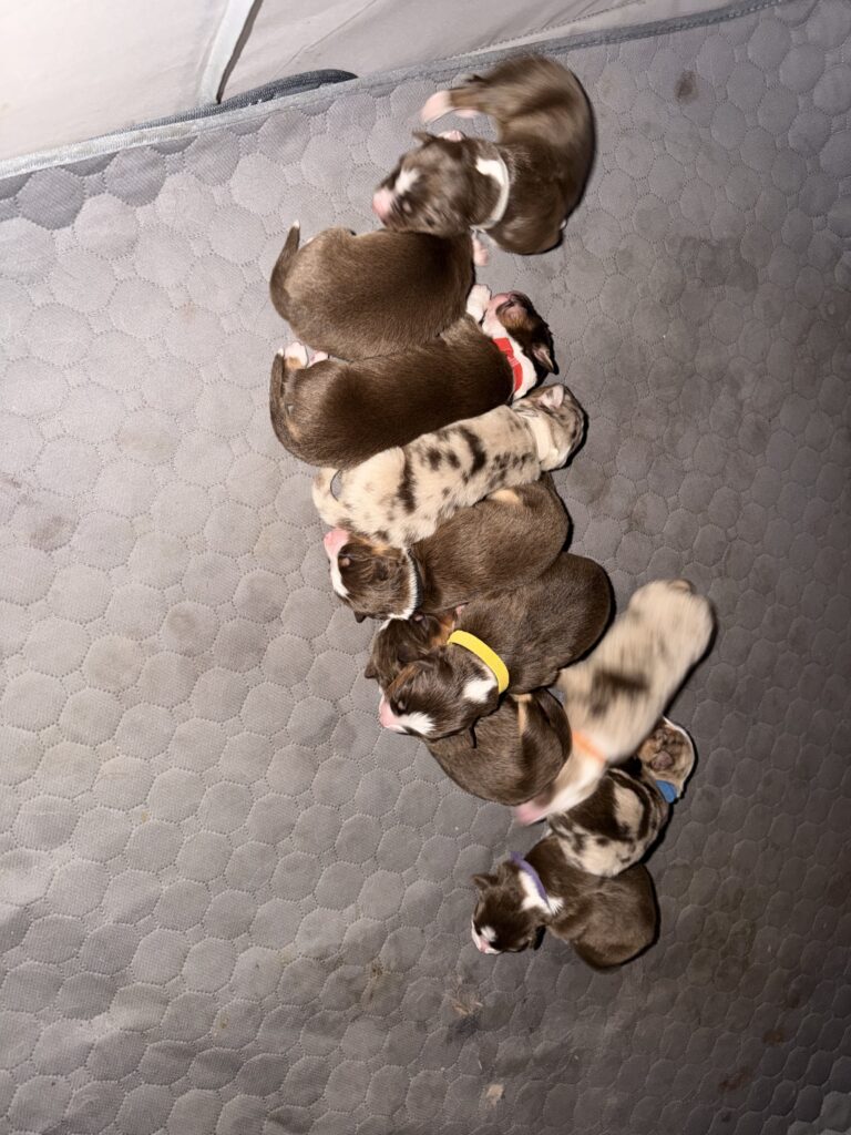 Hi, we’re Oakley and Dahlia, we just had our first ever litter! Oakley the dad is a seven year old red merle with dual colored eyes, one blue and the other one tan/light brown. He’s sired two other litters in the past. He has an extremely lovable and goofy disposition. He loves playing fetch and cuddling. While he does come from a registered bloodline, he does not have registry paperwork. Dahlia the mother is a three year old red tri. She’s always alert and watchful and can always be found sitting or laying looking out a window or door when she isn’t following me around watching her dad’s back. She’s very athletic and also loves fetch. Dahlia is CKC registered with papers. They’re both very family oriented, healthy, up to date on their shots and fed a grain free diet and raised as indoor, family dogs. All puppies will come with a certificate of health and shot records. Individual listings for each puppy will be posted tomorrow. More photos will be made available as they grow and on request. Deposit: $350