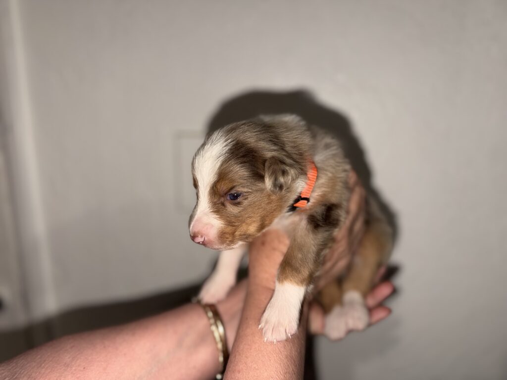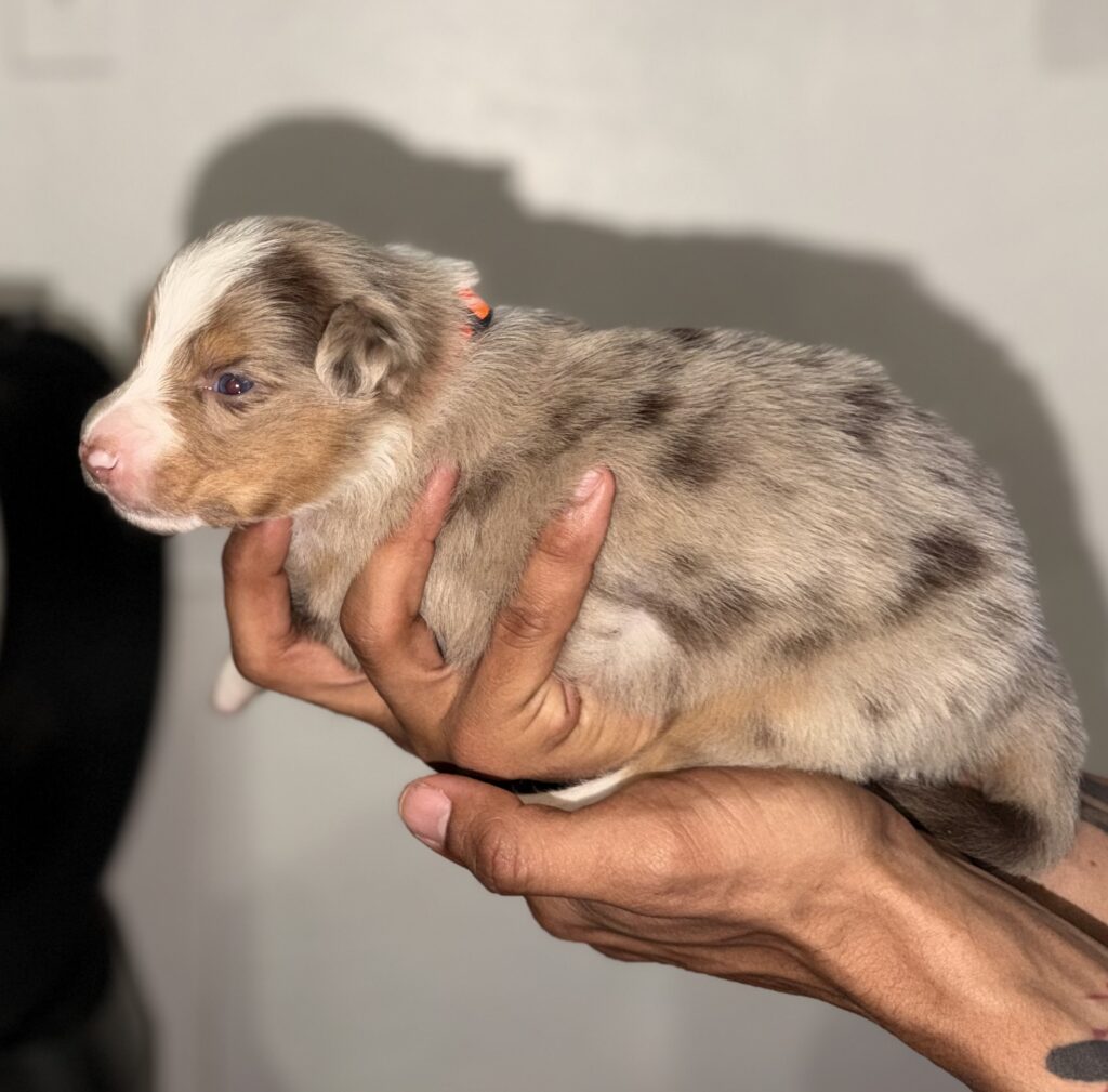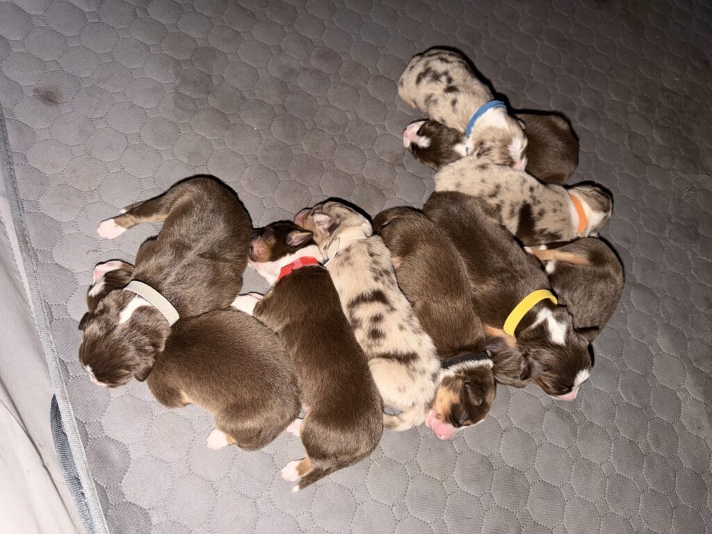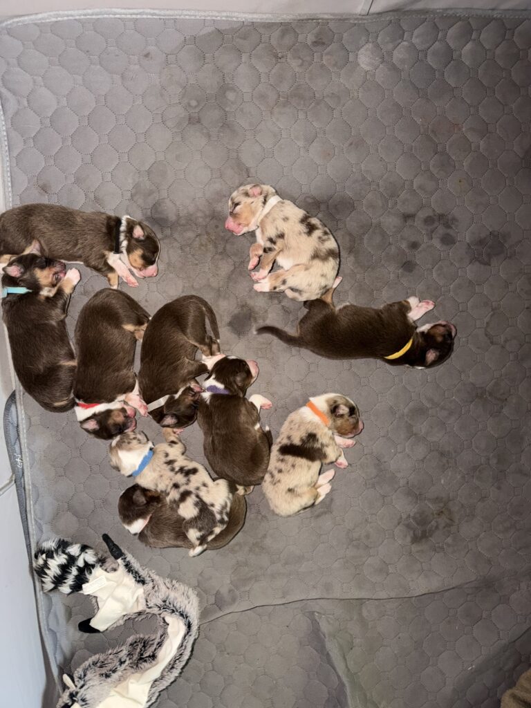 Hi, we’re Oakley and Dahlia, we just had our first ever litter! Oakley the dad is a seven year old red merle with dual colored eyes, one blue and the other one tan/light brown. He’s sired two other litters in the past.
