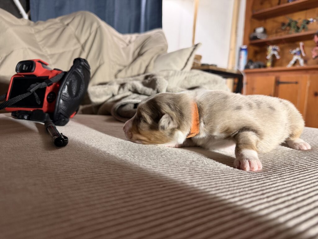 Dahlia the mother is a three year old red tri. She’s always alert and watchful and can always be found sitting or laying looking out a window or door when she isn’t following me around watching her dad’s back. She’s very athletic and also loves fetch. Dahlia is CKC registered with papers.