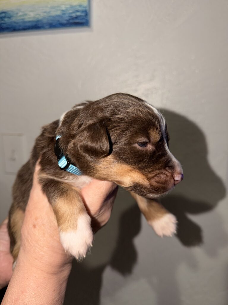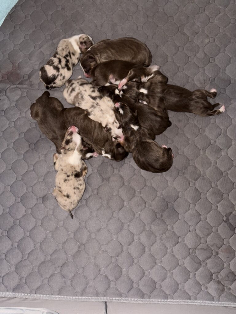 Hi, we’re Oakley and Dahlia, we just had our first ever litter! Oakley the dad is a seven year old red merle with dual colored eyes, one blue and the other one tan/light brown. He’s sired two other litters in the past.
