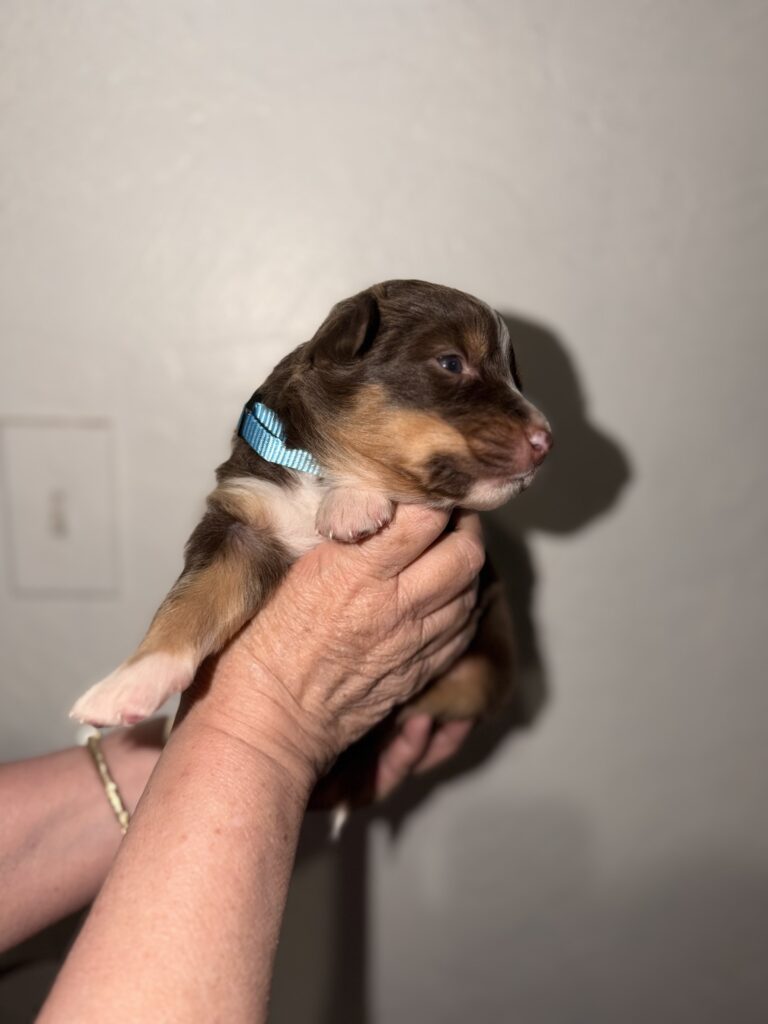 Dahlia the mother is a three year old red tri. She’s always alert and watchful and can always be found sitting or laying looking out a window or door when she isn’t following me around watching her dad’s back. She’s very athletic and also loves fetch. Dahlia is CKC registered with papers.