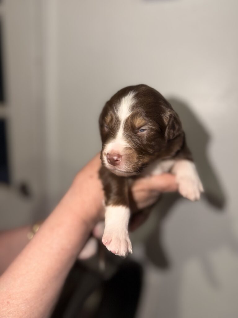 Hi, we’re Oakley and Dahlia, we just had our first ever litter! Oakley the dad is a seven year old red merle with dual colored eyes, one blue and the other one tan/light brown. He’s sired two other litters in the past.