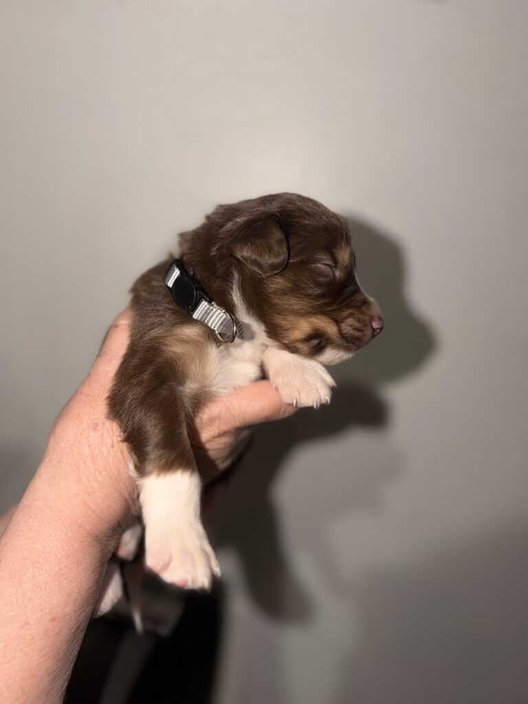 Dahlia the mother is a three year old red tri. She’s always alert and watchful and can always be found sitting or laying looking out a window or door when she isn’t following me around watching her dad’s back. She’s very athletic and also loves fetch. Dahlia is CKC registered with papers.