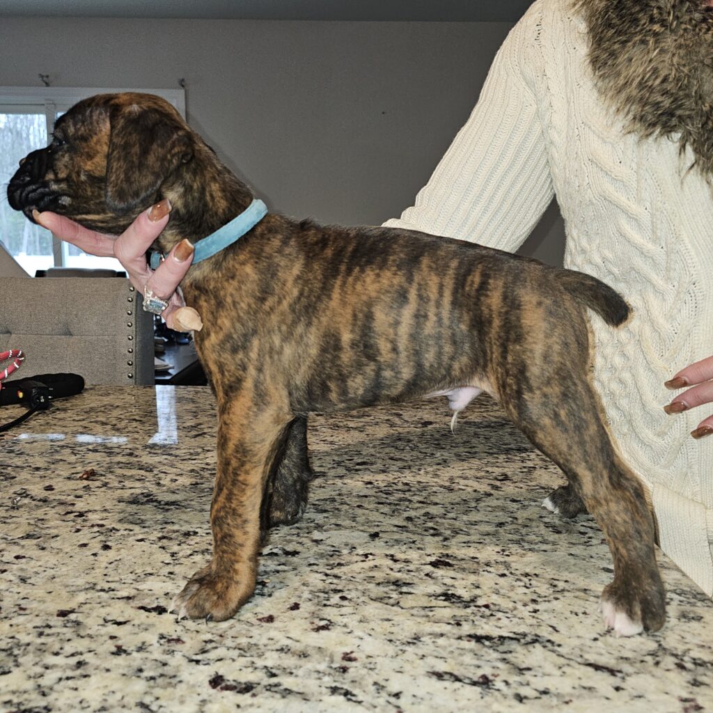 Willow is an adorable reversed brindle boxer puppy, her sleek coat a striking mix of dark base with lighter, tiger-like stripes that give her a unique, eye-catching appearance. At just a few months old, she’s a bundle of boundless energy and joy, with floppy ears that bounce as she dashes around and a wagging tail that never seems to stop.
