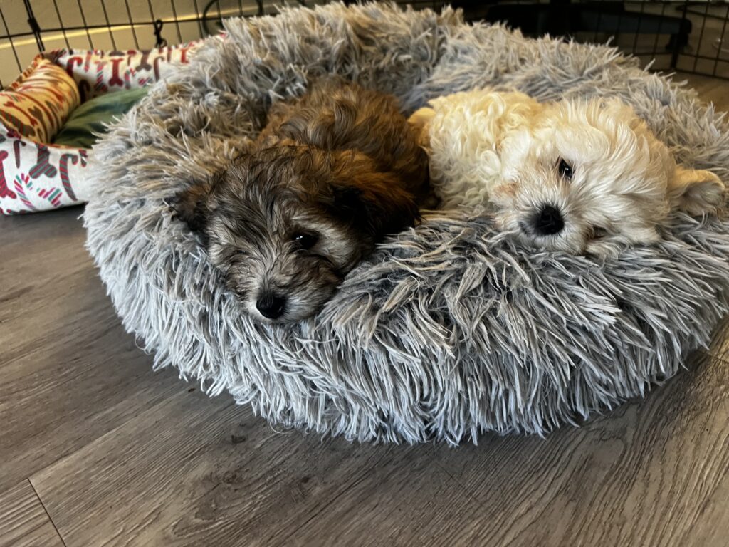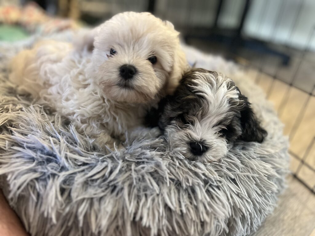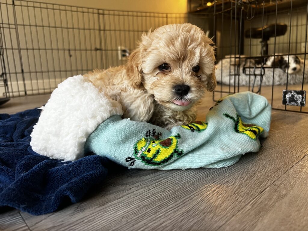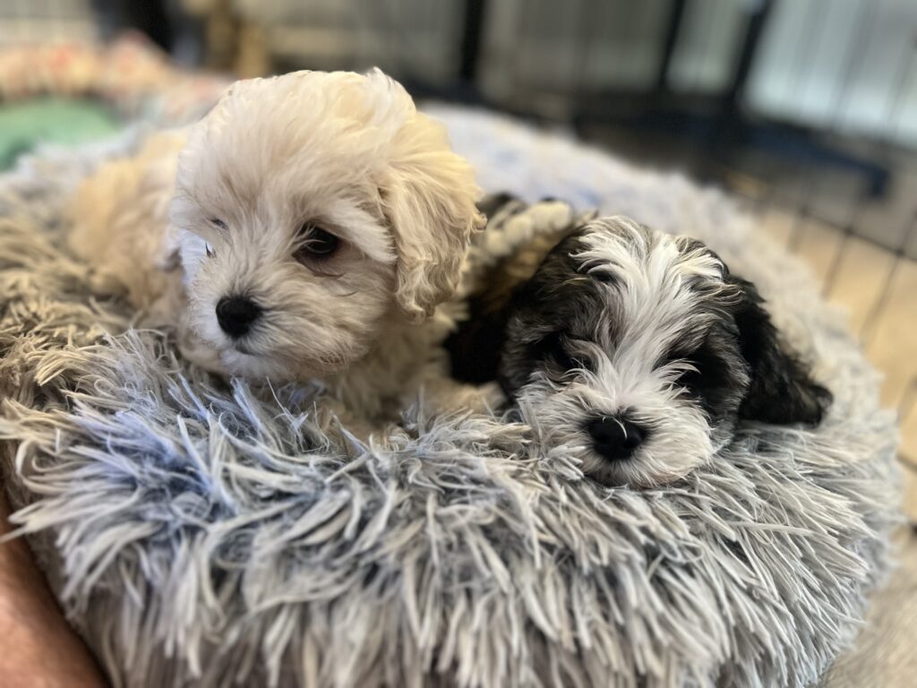 3 maltipoo/cavapoo puppies, two females (full white and dark brown), 1 male (golden). Born on November 17th. Mother’s second litter, and it is most likely her last. They have been dewormed and had their parvo shots. They are 8 weeks old and ready to go home as of 1/12/26. Send me a text at 510.331.9748 if you have questions or want to know the rehoming fee. The last six photos are pictures of mom and dad (first 3 pictures mom) and dad (last 3 pictures). The black and white puppy has been rehomedMom- cavapoo 12 pounds
