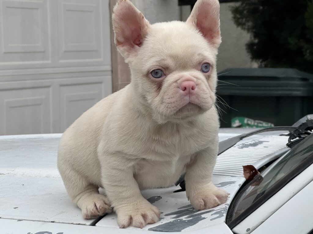 Chubbs is a VISUAL PINK Male that carries the Fluffy Gene, Chubbs has thick bone and amazing structure, and is the rarest color amongst the French Bulldogs. All PINKS have Ice Blue Eyes and Pink noses. The coat of the Pinks can appear as almost a cream or white, or a dark Rose Gold PINK depending on other dna Color factors.
