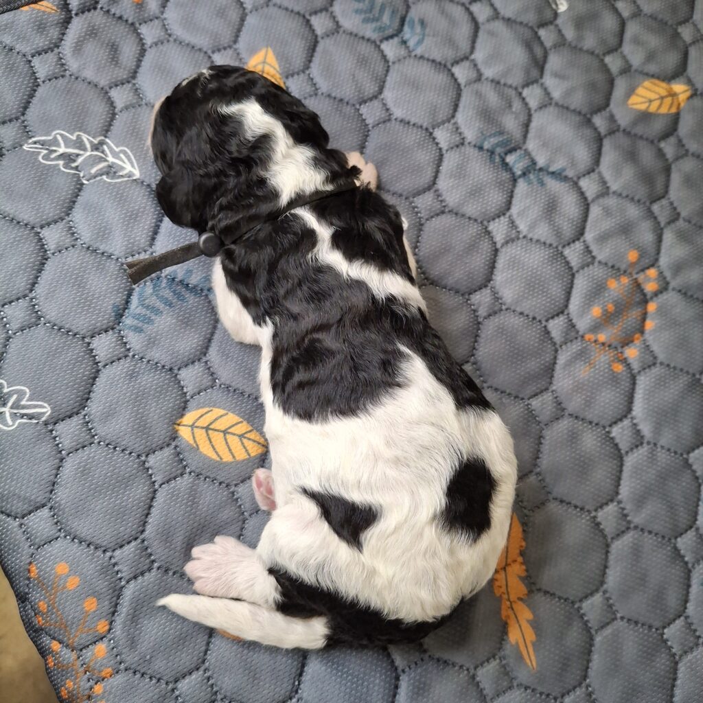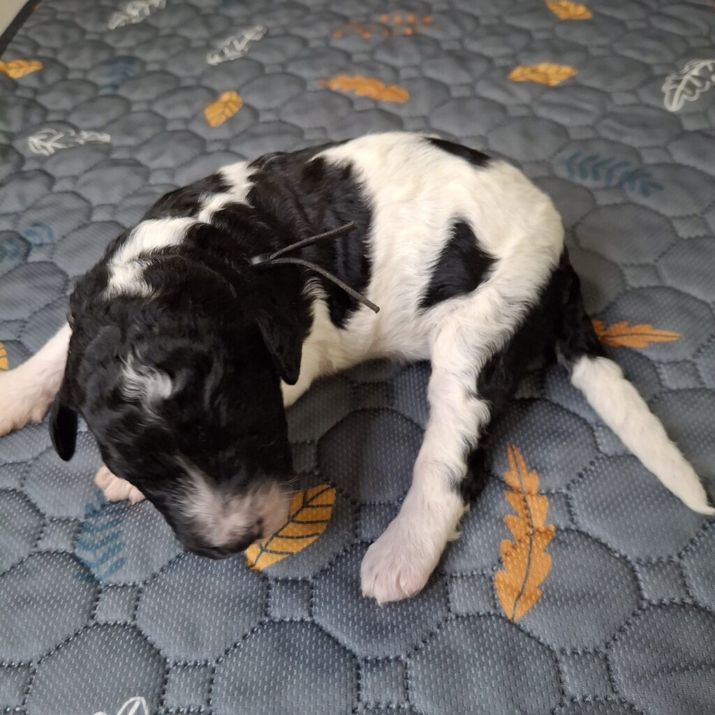Dancer is a white and black tuxedo Labradoodle with a coat so sleek it looks like she’s dressed up for the holidays