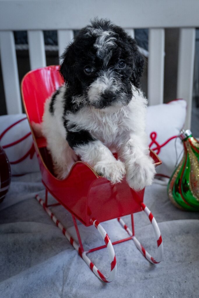 Dancer comes from a great program, is already getting Early Neurological Stimulation (ENS) training to build a confident foundation, and has been raised around children, making her an exceptional companion for family life. Best of all, with her specialty coat, she is hypoallergenic, which means she can bring her cheer and confidence to virtually any home. She’s a well-prepared, well-socialized pup with a heart full of holiday cheer and a coat everyone can love.