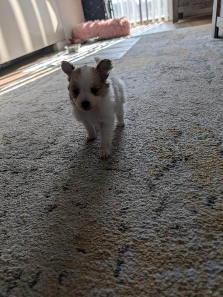 Bella is SUPER playful. She loves exploring and playing with her litter mates. If she’s not trying to cuddle with you, she’s jumping around with her sisters. She’s just the perfect bundle of joy to take home with you.