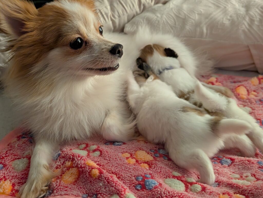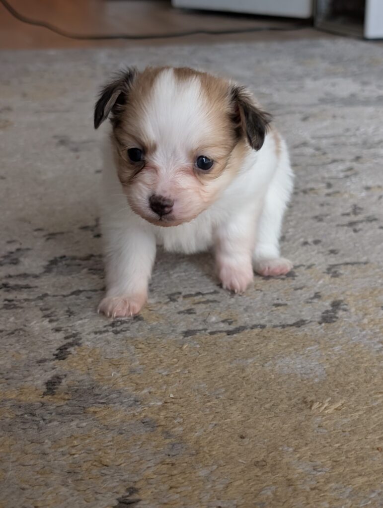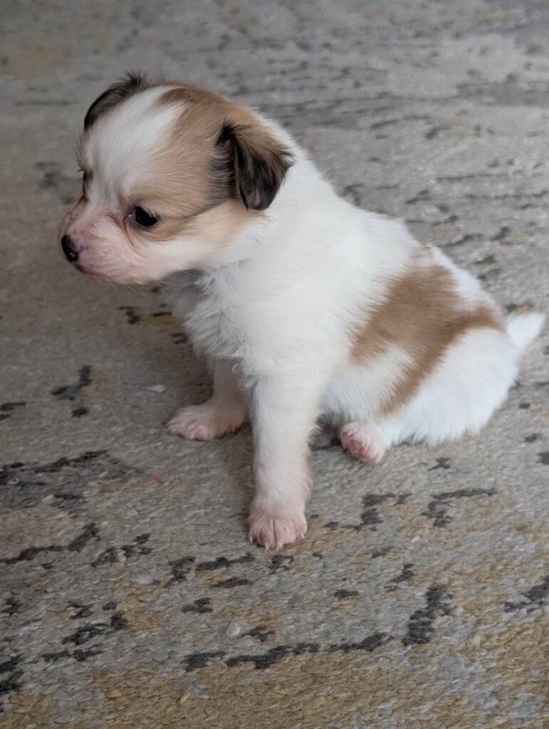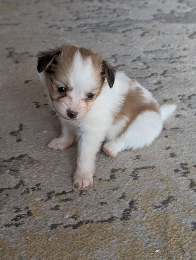 Dora is a beautiful Paparanian (Papillon x Pomeranian) with a precious face and a growing fluffy coat. She is being raised in a loving home environment and is handled daily to ensure she is well-socialized and confident.