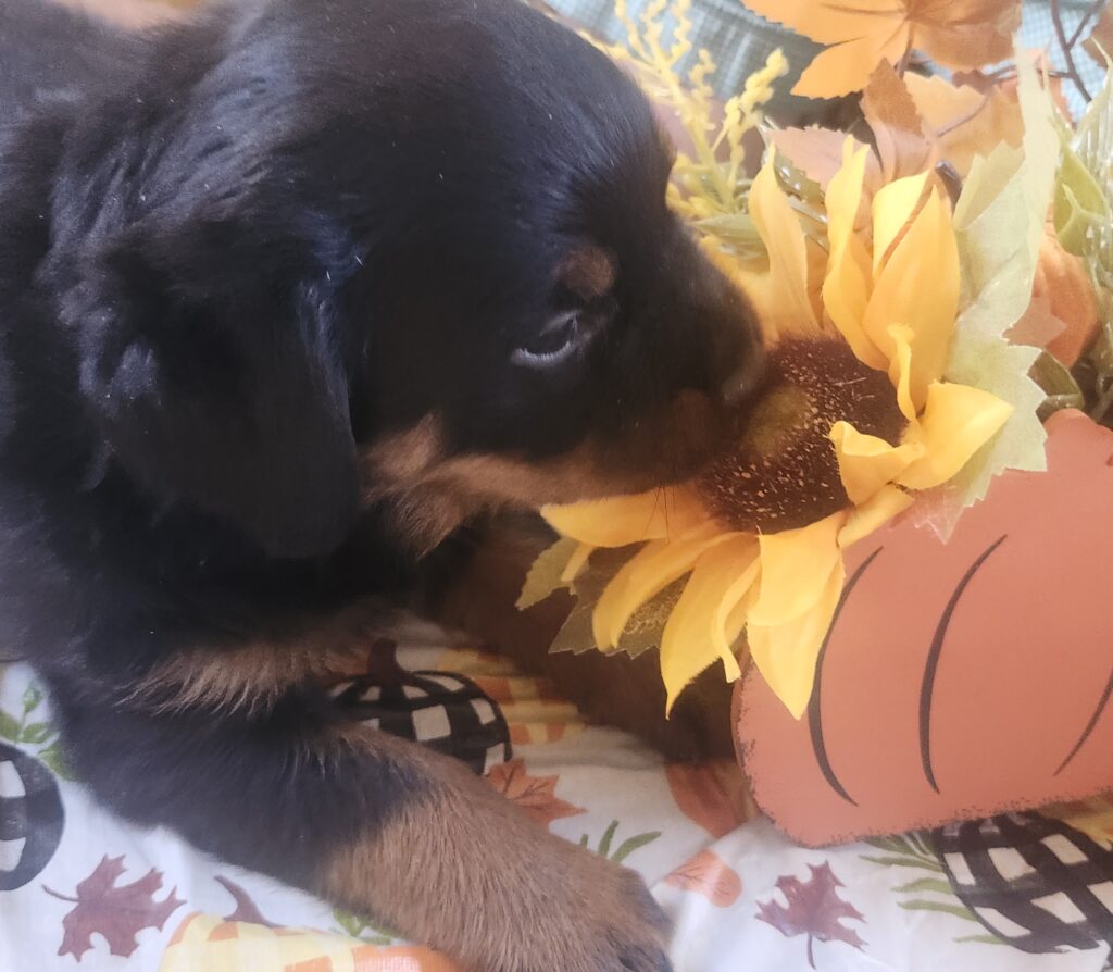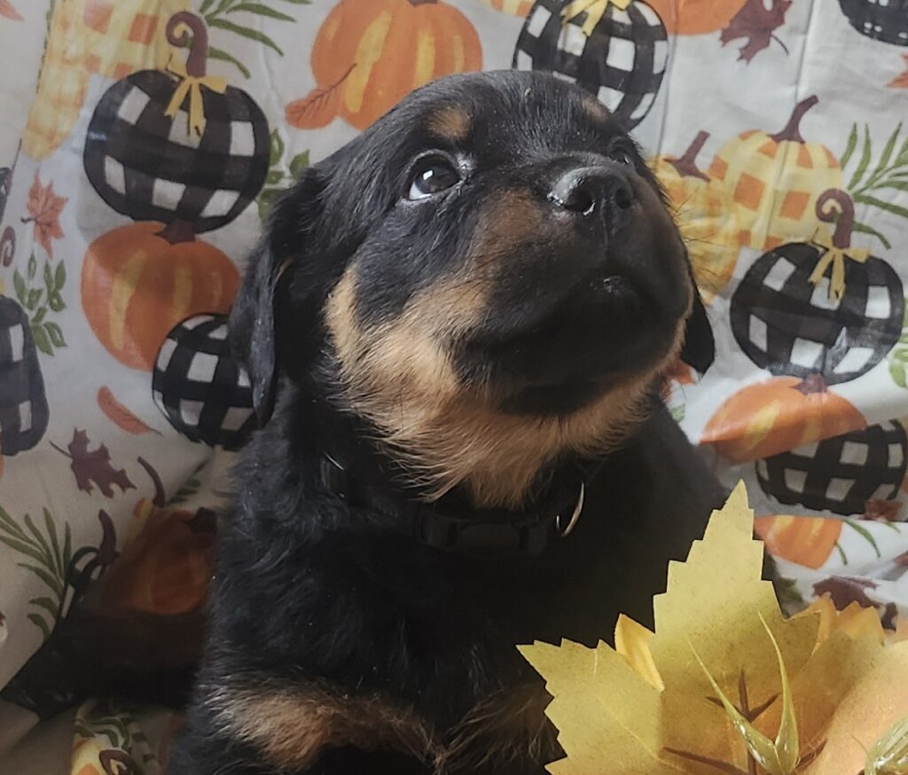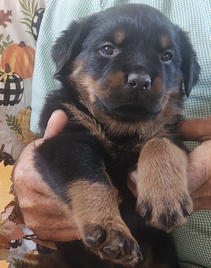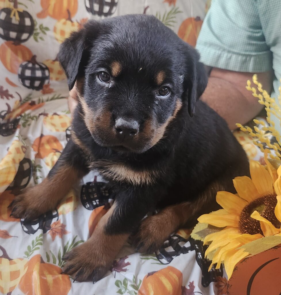 Pink is a gorgeous Rottie puppy. She is healthy, loving and smart with a good personality. Her tail is docked and her front dewclaws have been removed. Vaccines and deworming are current. She is pad-trained and eating dry puppy chow. There are 11 puppies in her litter. Sire has a European pedigree. Both sire and dam are AKC registered. Parents are gentle-natured with good dispositions. We will be happy to provide additional videos or pictures of her and/or the Dam and Sire.