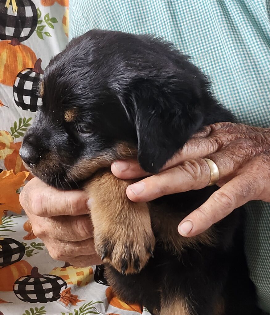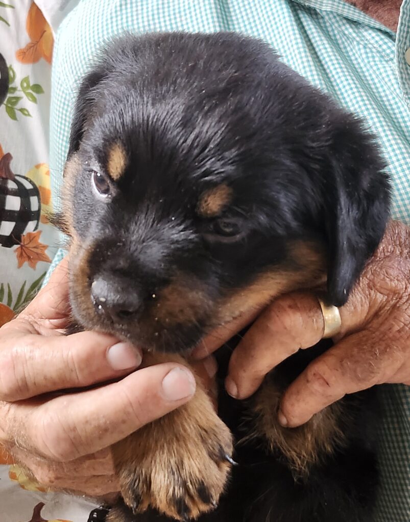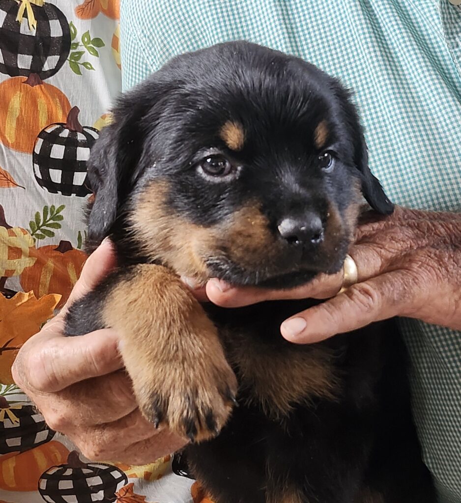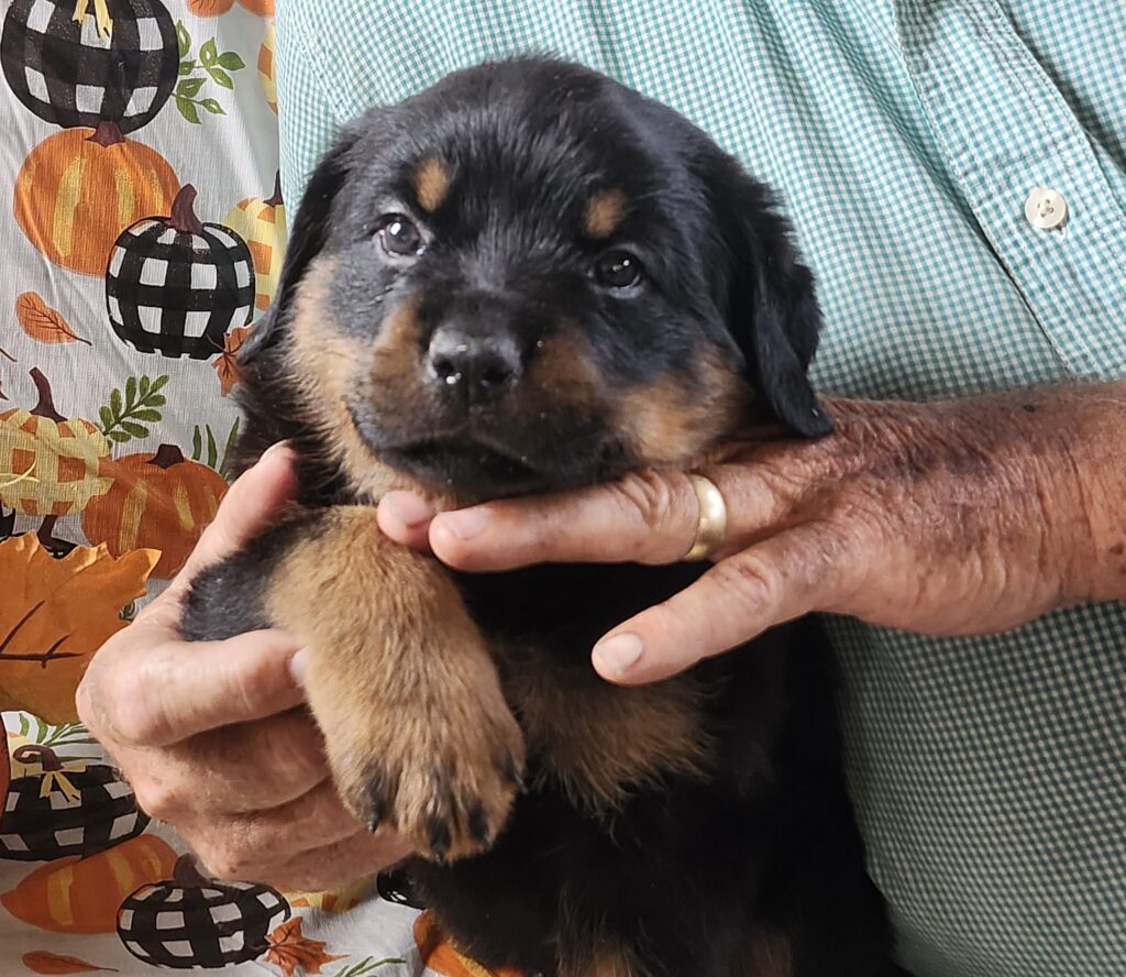 Sumo Pearl is a BIG beautiful Rottie puppy with a thick coat of longer fur. We originally called her Pearl because of her pearl collar, but she quickly became as big as our largest male, so we changed her name to Sumo Pearl because she reminded us of a Sumo wrestler! She is healthy, loving and smart with a good personality. She dominates the other puppies. Her tail is docked and her front dewclaws have been removed. Vaccines and deworming are current. She is pad-trained and eating dry puppy chow. There are 11 puppies in her litter. Sire has a European pedigree. Both sire and dam are AKC registered. Parents are gentle-natured with good dispositions. We will be happy to provide additional videos or pictures of her and/or the Dam and Sire.