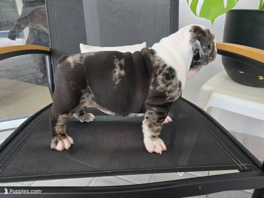 Beautiful female blue merle with soft hazel eyes and a striking, high-contrast coat pattern. She has a compact, thick build with a short back, nice bone and a sturdy, eye-catching presence even at this young age.