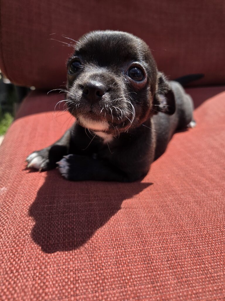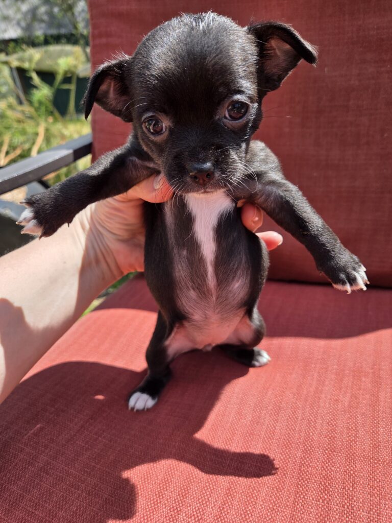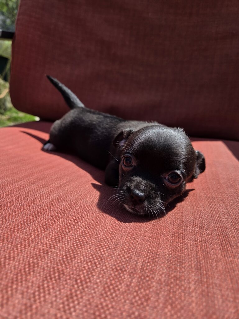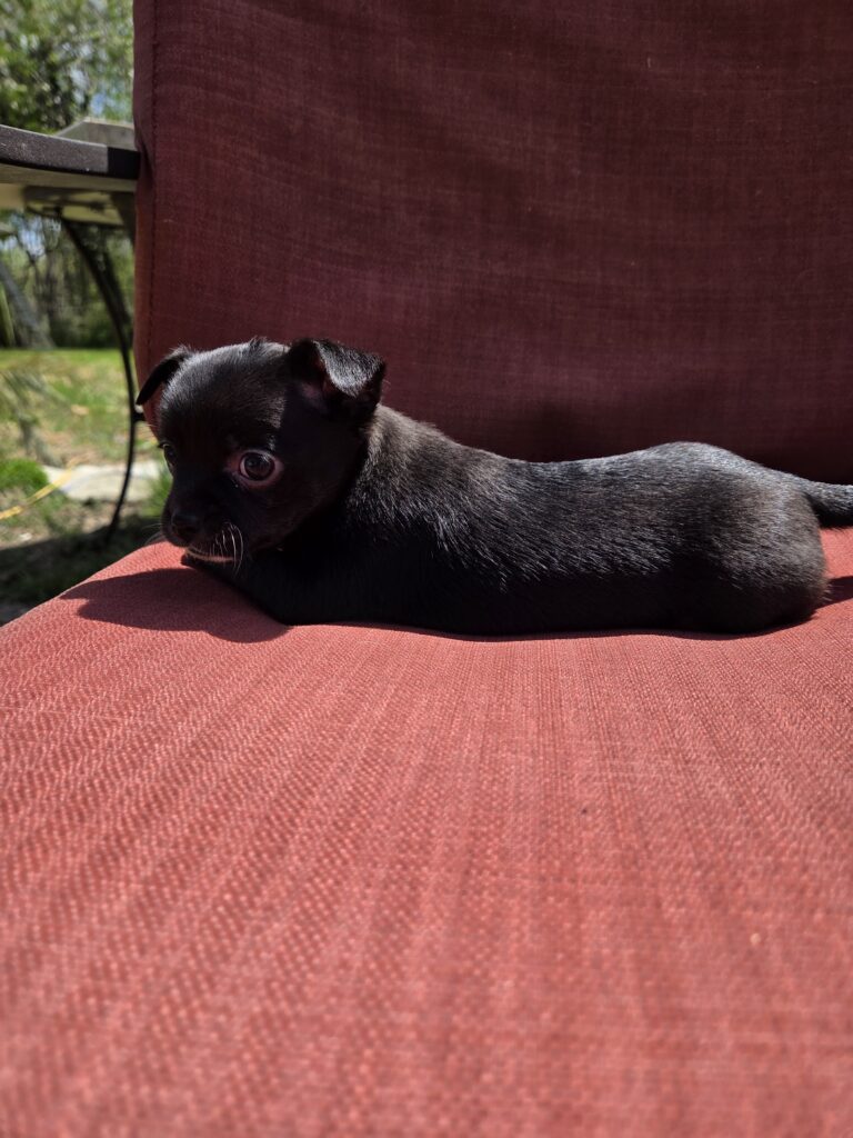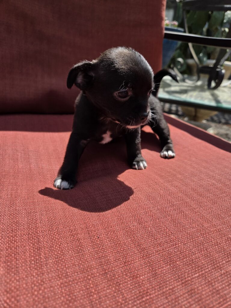 Female chihuahua from a litter of 5. She is black with white paws and chest markings. She is so docile and sweet, and very socialized. Mostly puppy pad trained! Her dad is a registered long haired Merle, weighing 8lbs, and mom is a brown short haired, weighing 10lbs. They just had their first shots and dewormer today (4/3/26). A $200 deposit is required for any hold. Must pick up by their 8wk birthday (4/17/26).Â