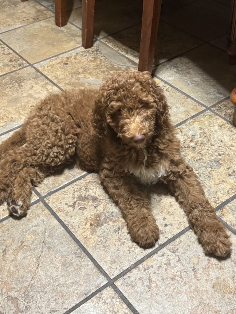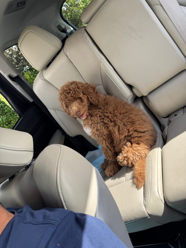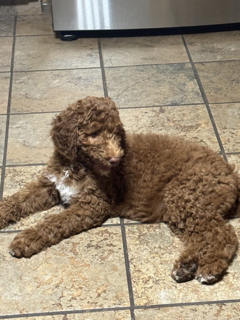 She is an excellent pup, very smart, loving, and energetic. She loves attention and is going to be a big girl weighing an approximate of 45 pounds when fully grown. Beautiful green eyes with her apricot hair and white chest make her unique.