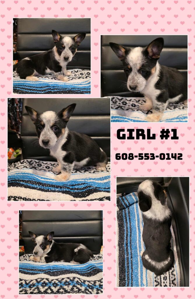 Meet this adorable mini cowboy corgi (corgi, mini blue heeler mix). Her mom is a pretty small merle corgi and her dad is a mini blue heeler. This little cutie is the perfect mix of fun, loyalty, and energy! She has had her first and second rounds of shots and has been dewormed, and has a clean bill of health from the vet. She’s well-socialized, playful, and ready to join her new family. She is highly trainable and would make a fantastic companion for active families, ranch life, or just a snuggle buddy. She is ready to go to her new loving family any day now. For any other questions, please contact me at 608-553-0142.Â