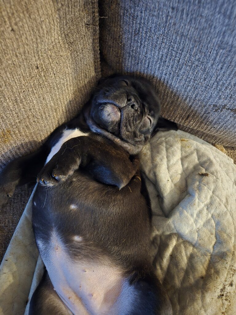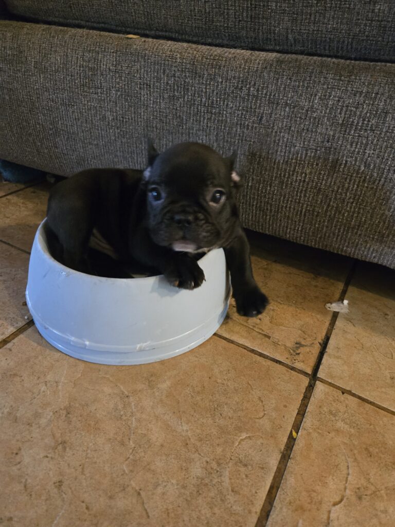Mac is brindle and white french bulldog puppy his coat is brindle with a white chest and belly. He’s super plauful and Cuddly and completely up to date on all age appropriate vaccinations. He isAKC registered and parents are both health tested.