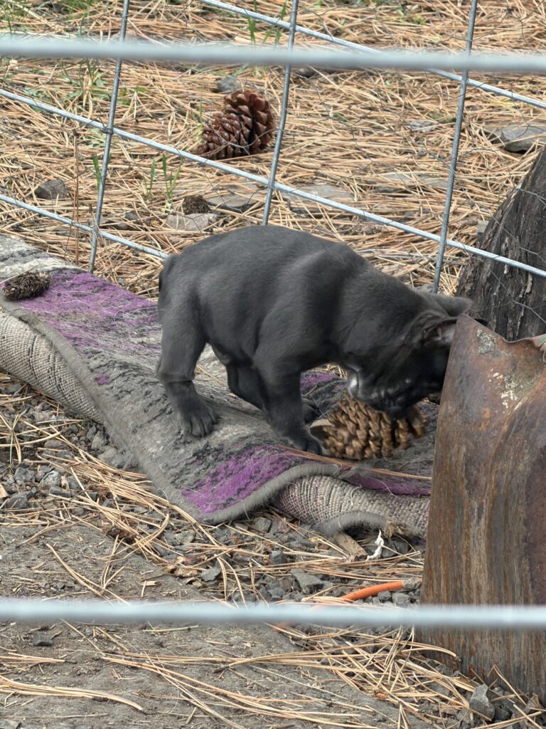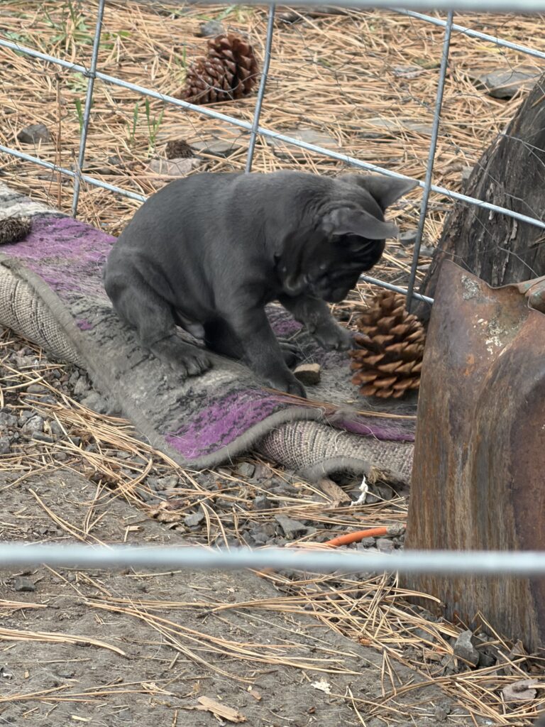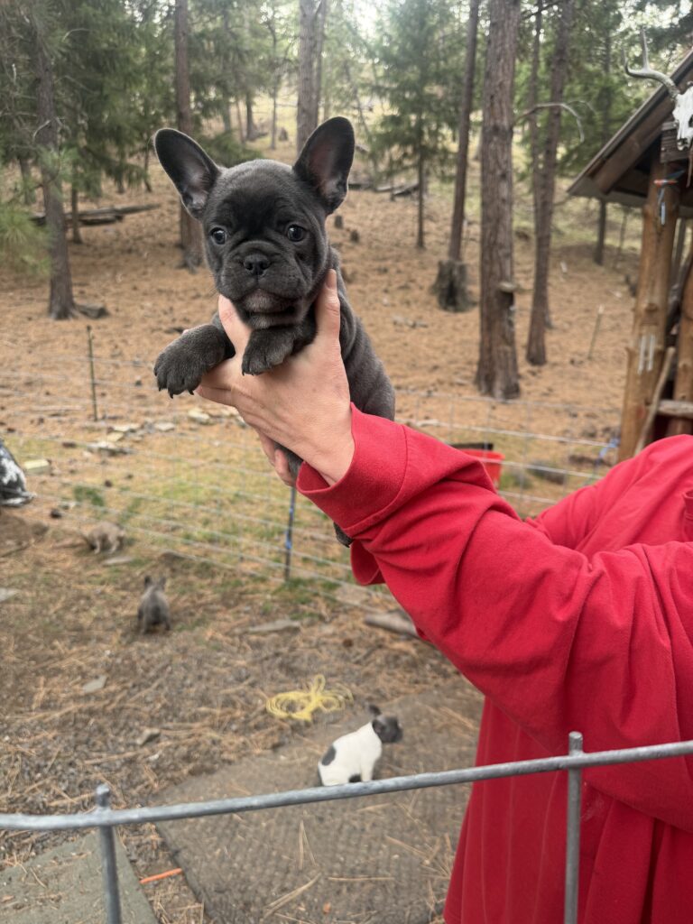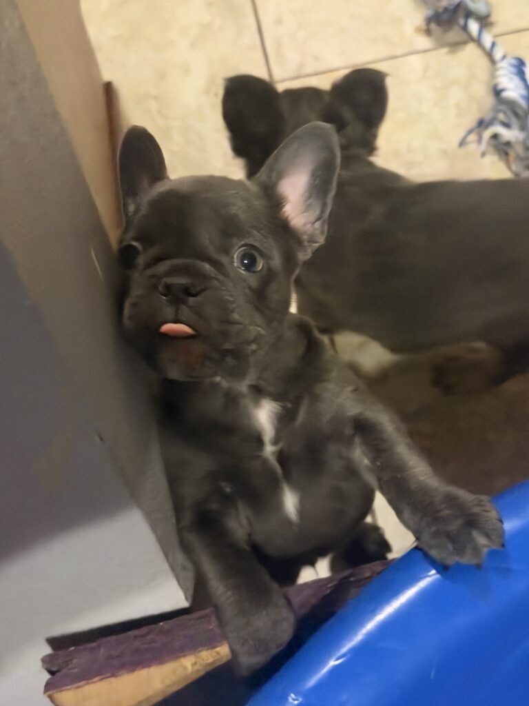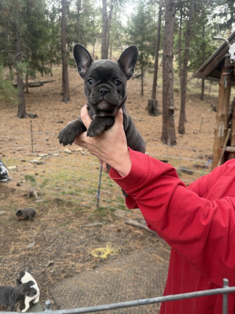 This is Razer he is one of the smaller ones (in the beginning not so much any more) he is a beautiful blue French bulldog puppy he has a small white patch on his chin and a small strip of white on his chest he will have first vet check deworming shots and he will have a chip in his neck and full papers Ready for his new home around November 22 , dam and sire are 6 panel cleared and their Sire has been OFA tested and has a CHIC certificate