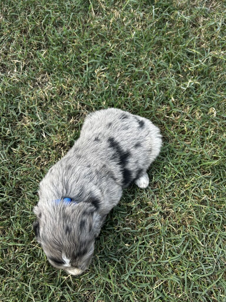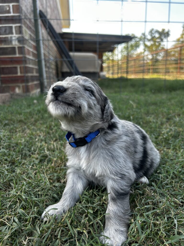 Maverick is a handsome blue merle Golden Aussie with soft silver, gray, and black markings that make him truly one of a kind. His curious expression and gentle personality are already starting to shine through, and he’s always ready to explore what’s around him. Maverick comes from our sweet Golden Retriever, Sadie, and our loyal blue merle Australian Shepherd, both intelligent, loving, and family-oriented. With this wonderful mix, Maverick is sure to grow into a smart, playful, and affectionate companion who will thrive in a home full of love.