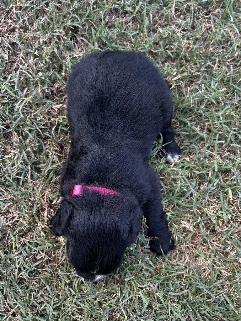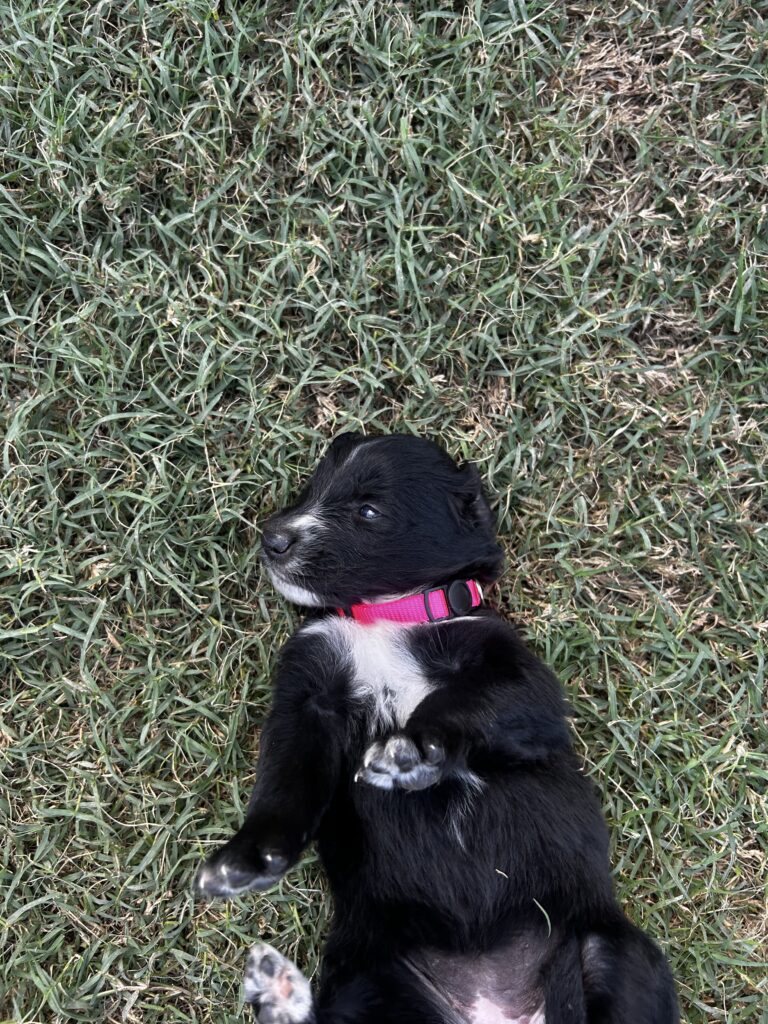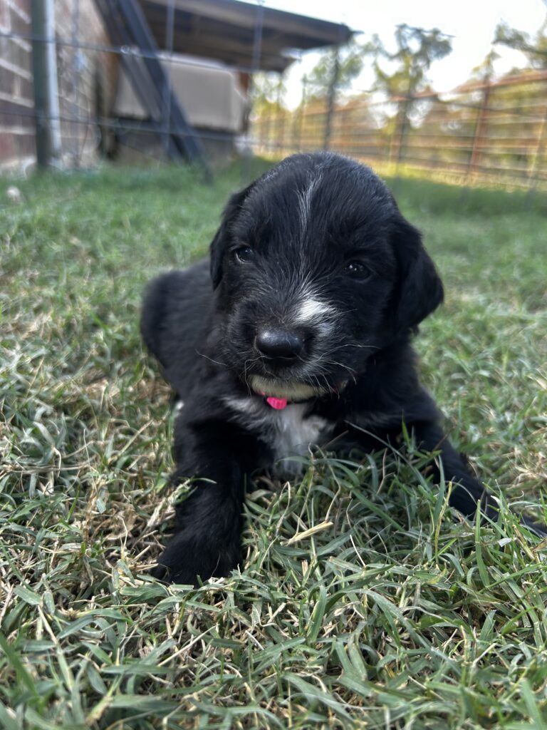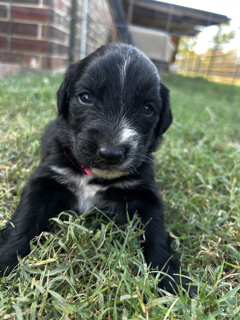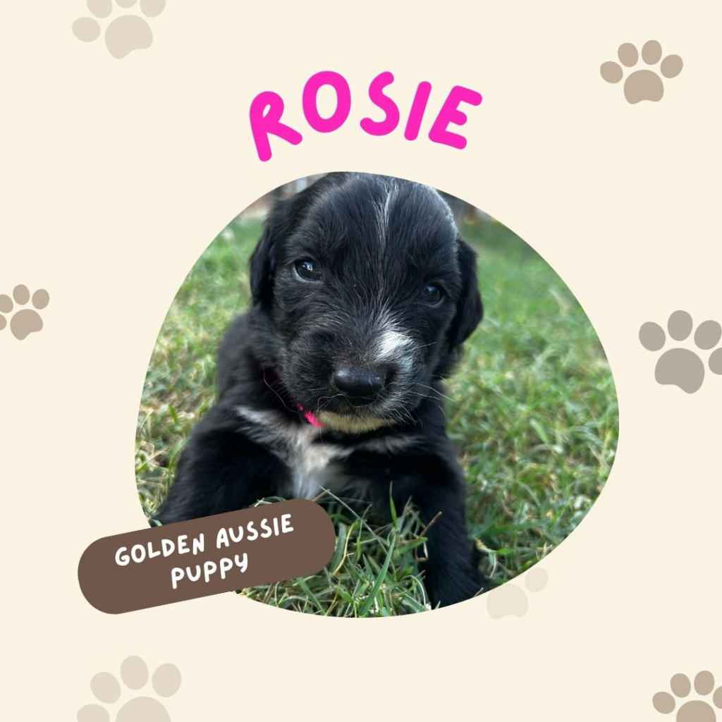 Rosie is a beautiful Golden Aussie girl with a sleek black coat, a white blaze on her face, and a charming patch on her chest that makes her stand out. Her bright eyes and curious personality are already showing, and she loves to be close by and take in the world around her. Rosie comes from our sweet Golden Retriever, Sadie, and our loyal blue merle Australian Shepherd, both loving, intelligent, and family-oriented. With this wonderful blend, Rosie is sure to grow into an affectionate, playful, and loyal companion.