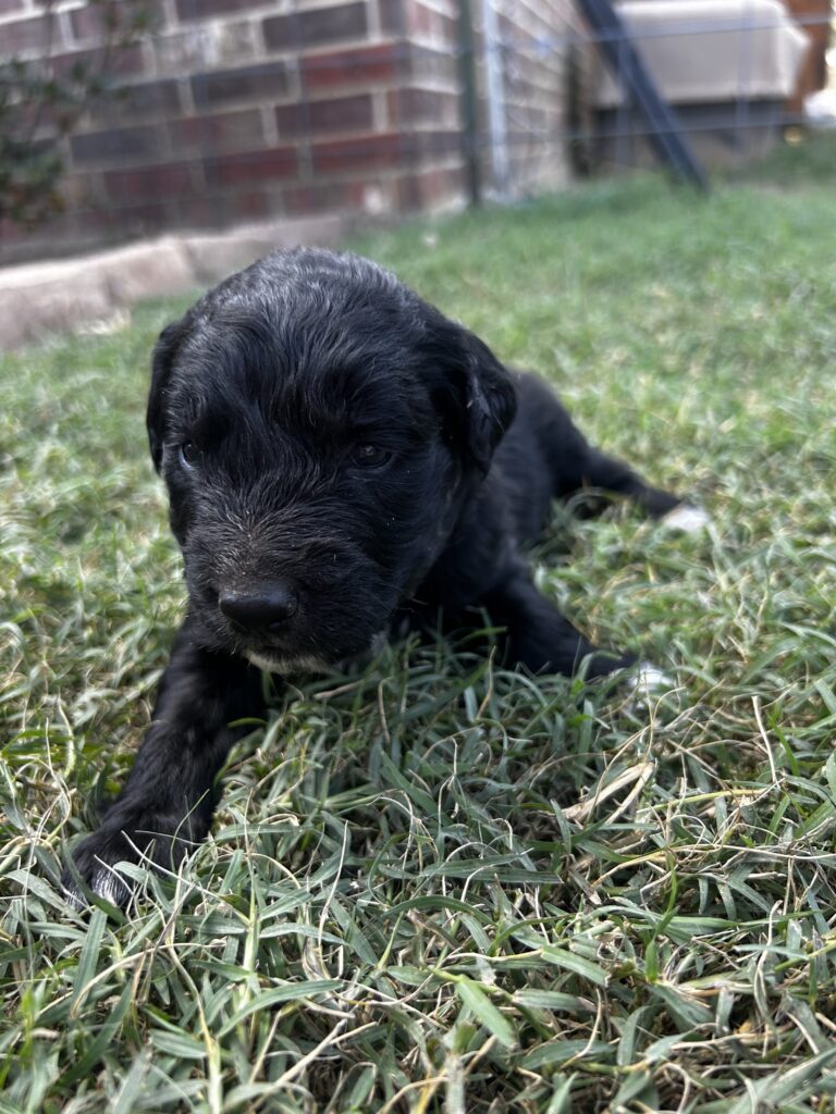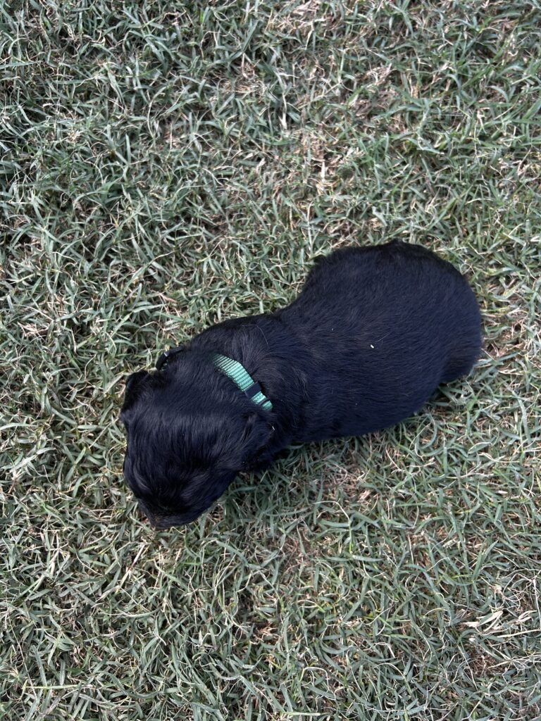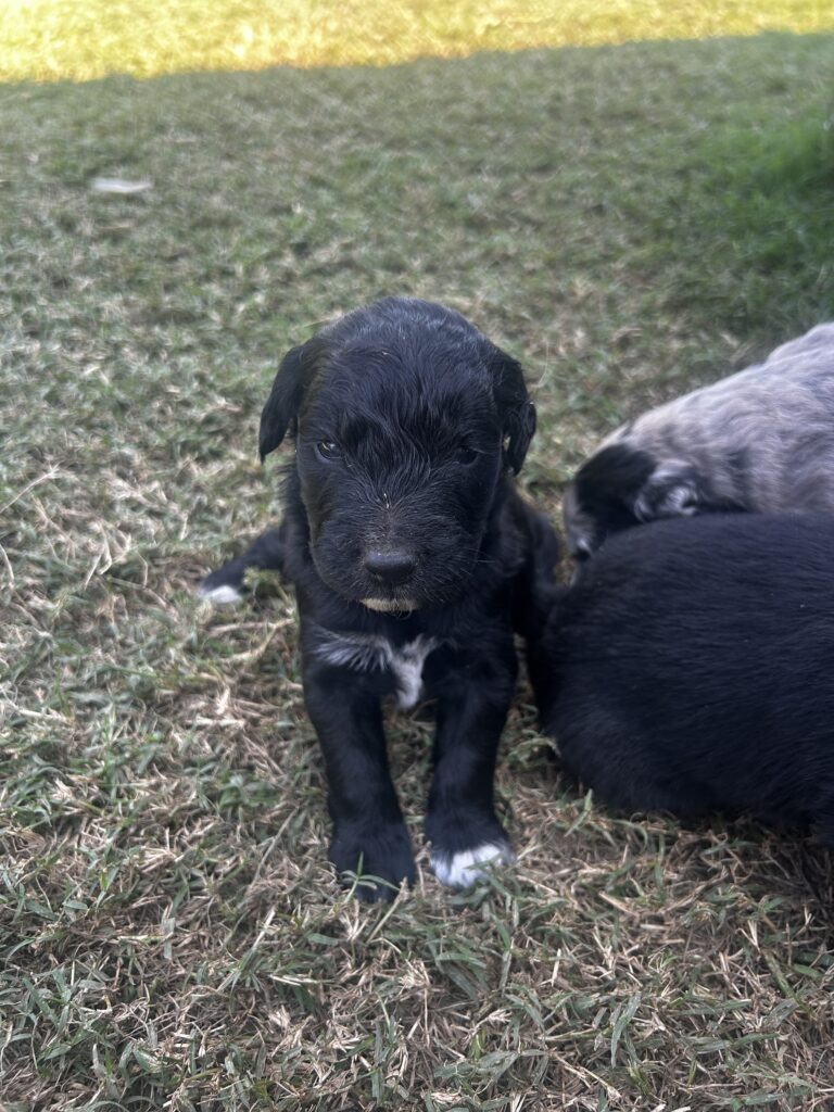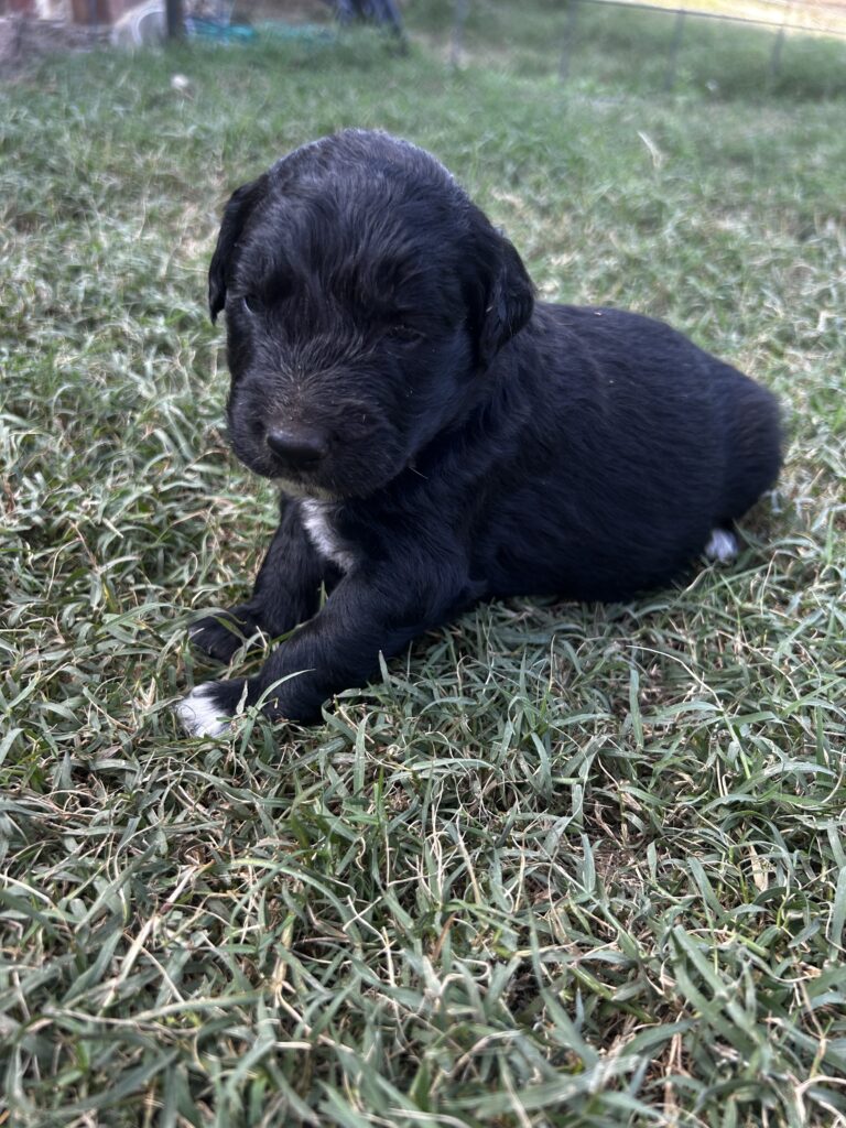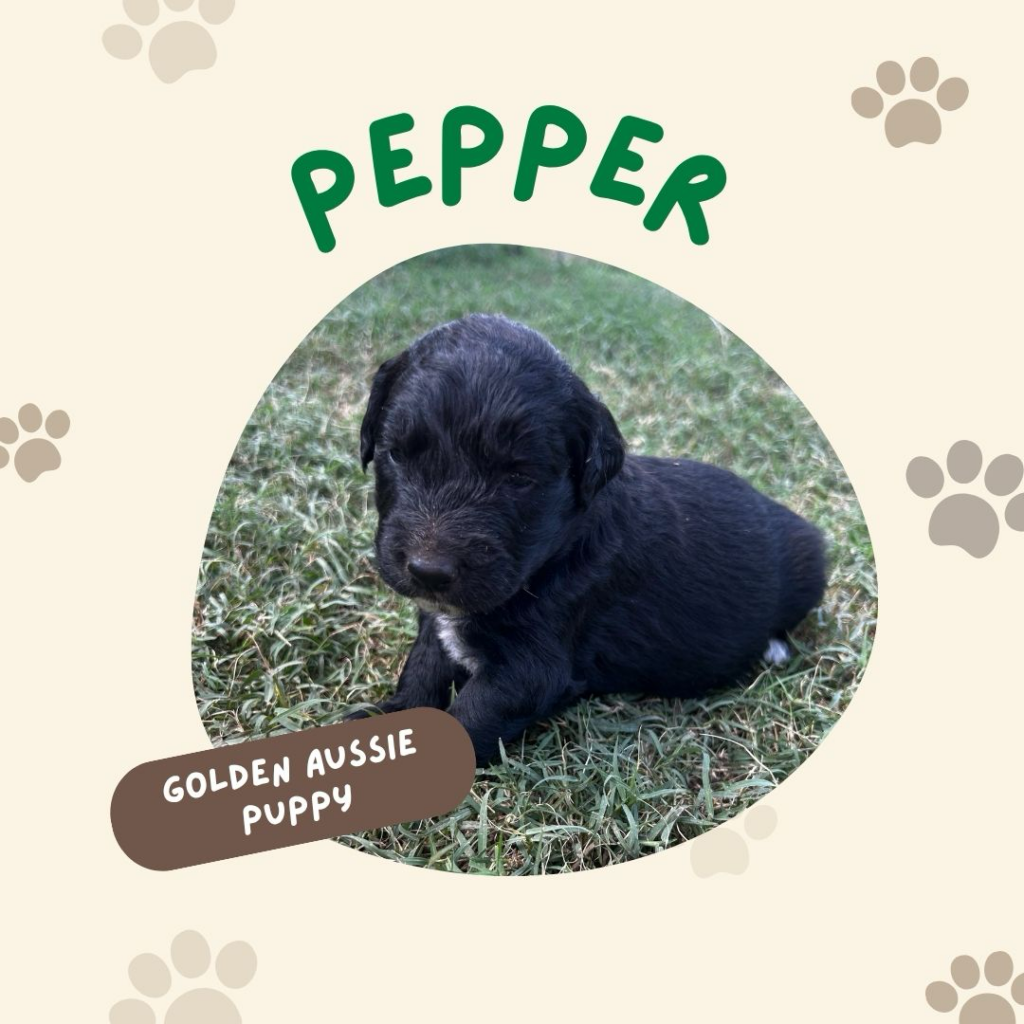 Pepper is a beautiful Golden Aussie boy with a sleek black coat, a white blaze on her face, and a charming patch on her chest that makes him stand out. His bright eyes and curious personality are already showing, and he loves to be close by and take in the world around her. Pepper comes from our sweet Golden Retriever, Sadie, and our loyal blue merle Australian Shepherd, both loving, intelligent, and family-oriented. With this wonderful blend, Pepper is sure to grow into an affectionate, playful, and loyal companion.