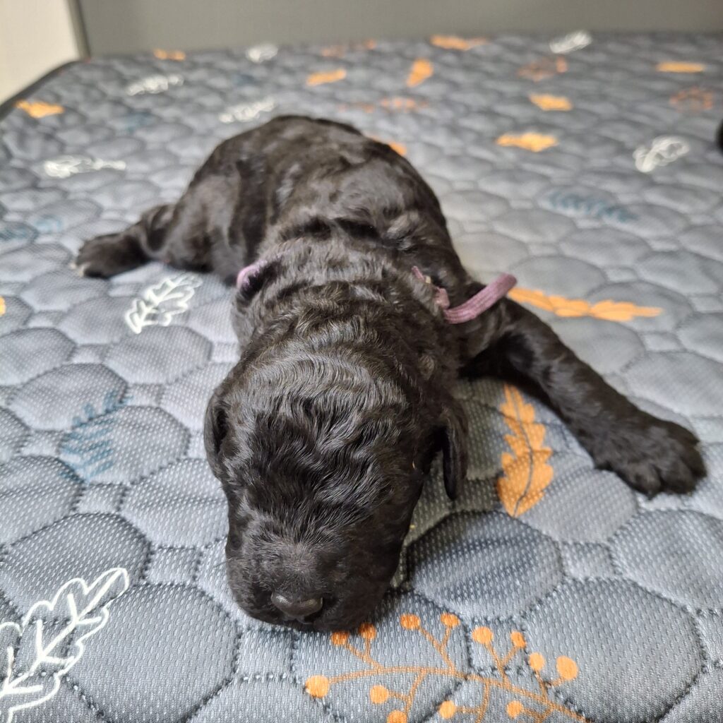 Joys deep black coat shimmers with a soft sheen it is the silkiest in the entire litter. When she moves, it’s like a little cloud of velvet gliding across the floor. She has a calm, loving spirit and an old-soul sweetness that draws everyone in. Whether she’s quietly cuddled up or wagging her tail in excitement, Joy lives up to her name in every way.