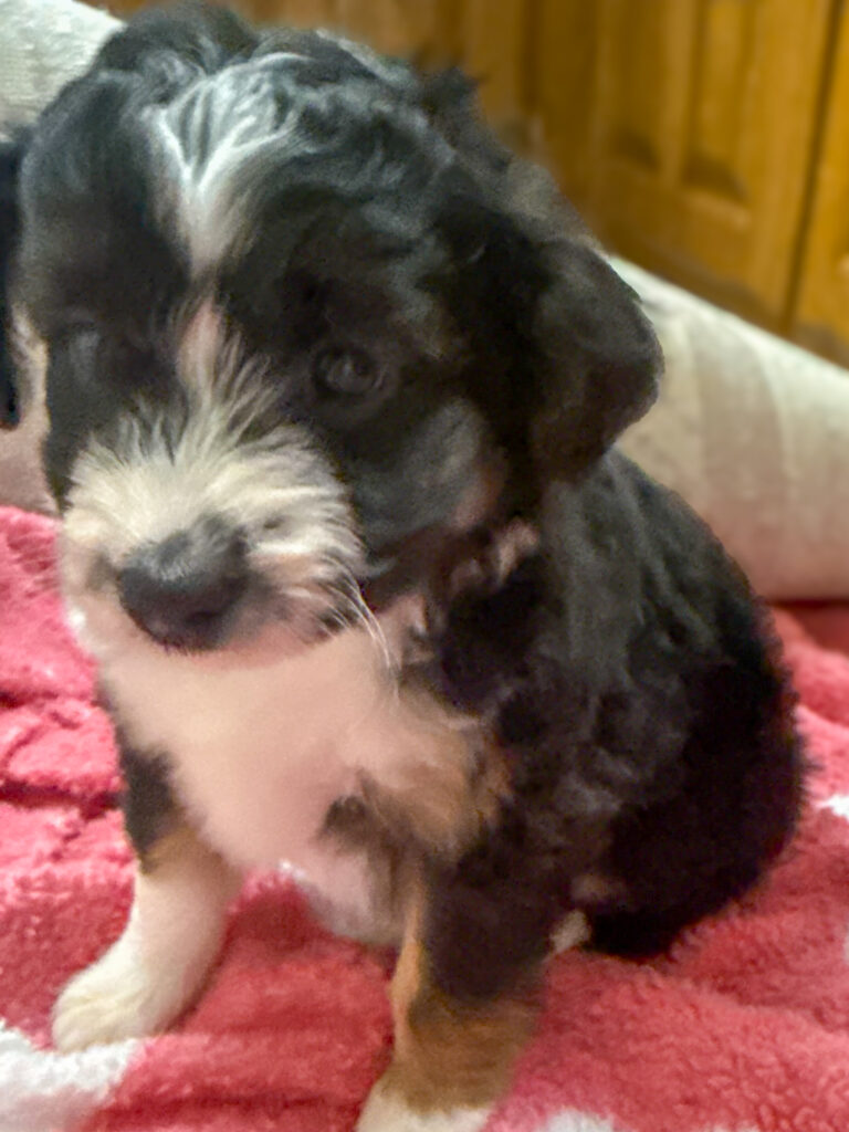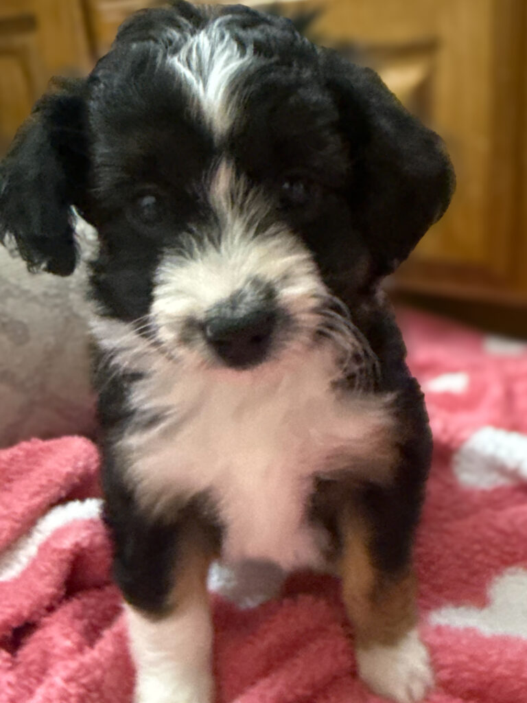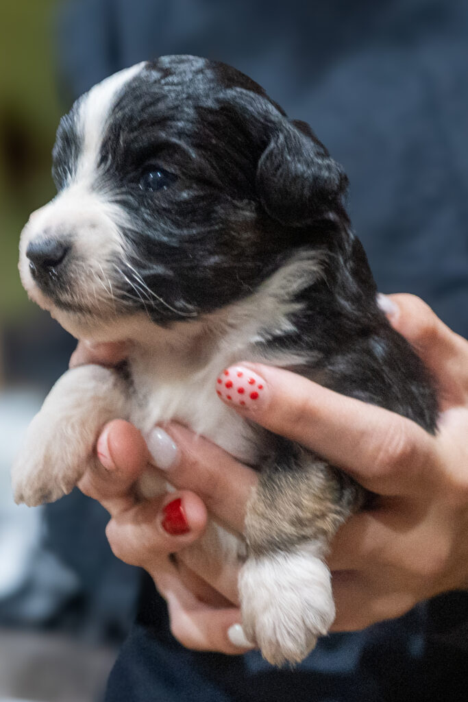 Introducing Lola, a delightful little pup who’s as sweet as can be! Lola is an F1 Toy Aussiedoodle, but don’t let her size fool you! She is a love bug with a big personality – she’s already found her voice and knows how to use it! She gets along famously with her siblings, parents, and young kids alike. She has her tail docked and dew claws removed. She’ll likely end up around 15-20 lbs.