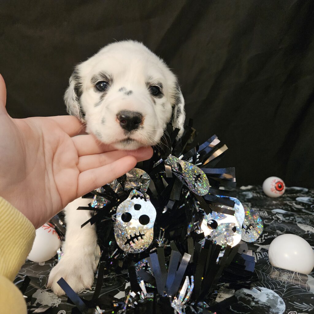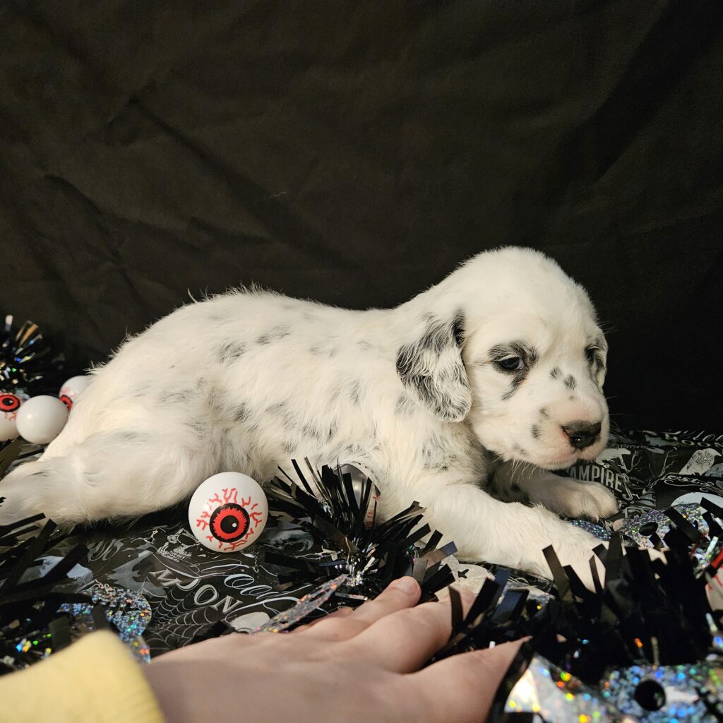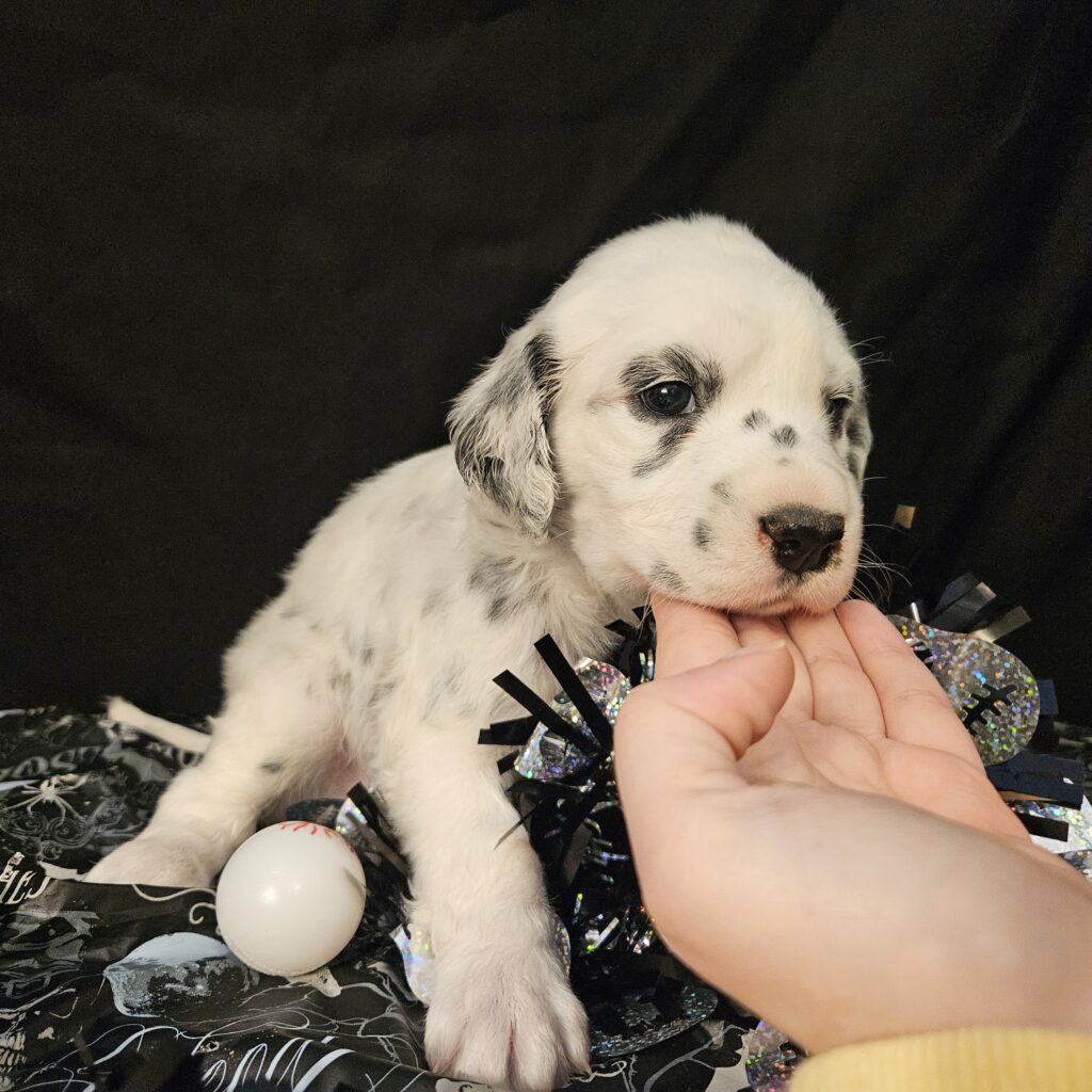 Hi I am Aura!! I am a black and white spotted Long coat dalmatian! I look just like my grandpa! He was a champion through the AKC. Since I am a long coat and was born with no spots my spots take longer to come through! I will come with health guarantee vet examination shot records and deworming every 2 weeks since birth. I am raised in a loving home passionate about dalmatians. They are part of our family so I will be very confident and playful! Contact to reserve me at 832-878-9629 i have added a fully grown litter mate from previous litter you have an idea of how spotting will develop!