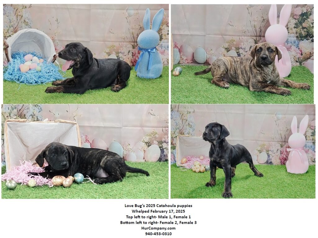 Updated 4.8.2025 IF YOU WOULD LIKE INFORMATION ABOUT MY PUPPIES, PLEASE INCLUDE YOUR PHONE NUMBER. DUE TO SCAMMERS, I REQUIRE A PHONE CALL TO TALK TO YOU DIRECTLY. Hur Family Farm (HurCompany.com) is located in Cumby, Texas. Puppies start at $100 and up. Please contact me directly for pricing. Hur’s Love Bug’s 2025 Catahoula Puppies Bug whelped February 17, 2025 Sired by Remington 4 puppies 1 male 3 females Puppies Include a New Owner Puppy Class & LIFETIME support ALL Puppy Owners are REQUIRED to sign the AKC S.T.A.R. Puppy Pledge Contract Socialization Training Activity Responsibility AKC Canine Good Citizen training is HIGHLY recommended for all of my puppies https://www.akc.org/products-services/training-programs/canine-good-citizen/ I WILL PAY YOU $50 FOR COMPLETING THE AKC GOOD CITIZEN TRAINING Vet checked ​*​All puppies are individually vet checked prior to pick up.  This includes a fecal exam and Rabies vaccination if over 12 weeks old ($25 fee). *Additional fee for puppies under $600 There is a fee for a USDA Health Certificate required for shipping Dewormer ​Dewormings at 2, 3, 4, and 5 weeks with Pyrantel Pamoate. Deworming at 6 weeks with Ivermectin. Deworming at 8 weeks with Fenbendazole (3 days). Every 2 weeks after that. Coccidia preventative TOLTRAZURIL 5%-  a single dose of Toltrazuril prevents and cures coccidiosis in puppies. VACCINATIONS Nobivac Intra-Trac 3-  Protects against Bordetella, canine parainfluenza virus, and canine adenovirus type 2 NeoPar-  Maximum Protection against Parvovirus- Contains a High Antigen Mass Nobivac® Canine 1-DAPPv prevents Canine Distemper, Adenovirus Type 1 (Hepatitis), Adenovirus Type 2 (Respiratory Disease), Parainfluenza, and Parvovirus FLEAS Capstar treatment MICROCHIP Prepaid LIFETIME Microchip