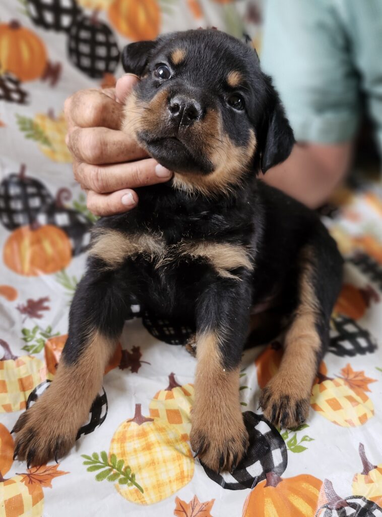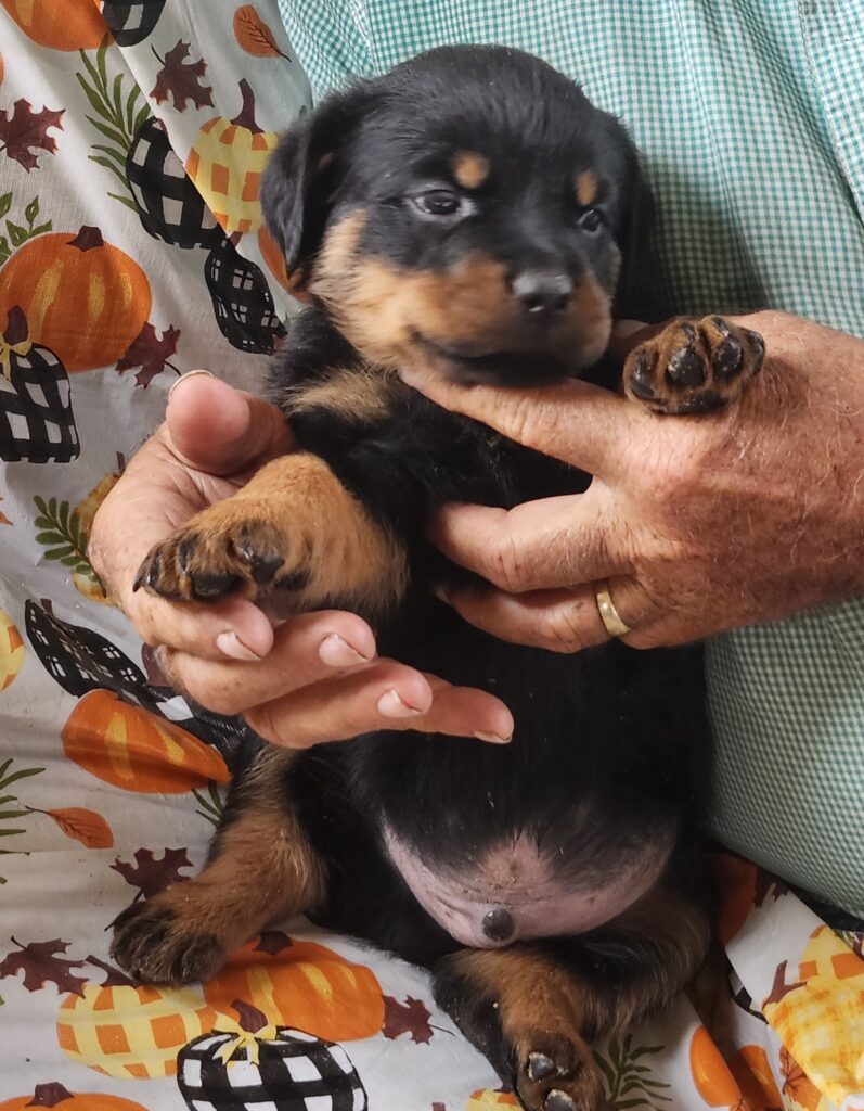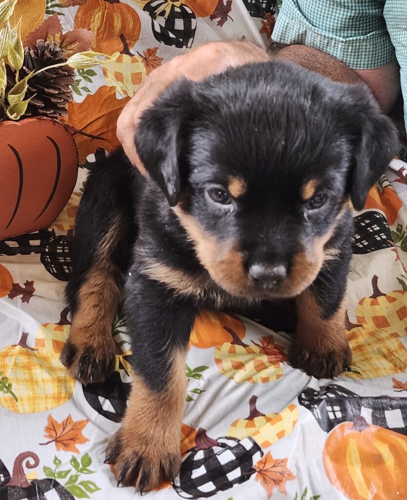 Royal (Roy) is a handsome Rottie puppy. He is healthy, loving and smart with a good personality. His tail is docked and front dewclaws have been removed. Vaccines and deworming are current. He is pad-trained and eating dry puppy chow. There are 11 puppies in his litter. Roy is the smallest puppy in the litter, but the smallest puppies in our last litter became the biggest adult dogs of them all. Sire has a European pedigree. Both sire and dam are AKC registered. Parents are gentle-natured with good dispositions. We will be happy to provide additional videos or pictures of Roy and/or the Dam and Sire.