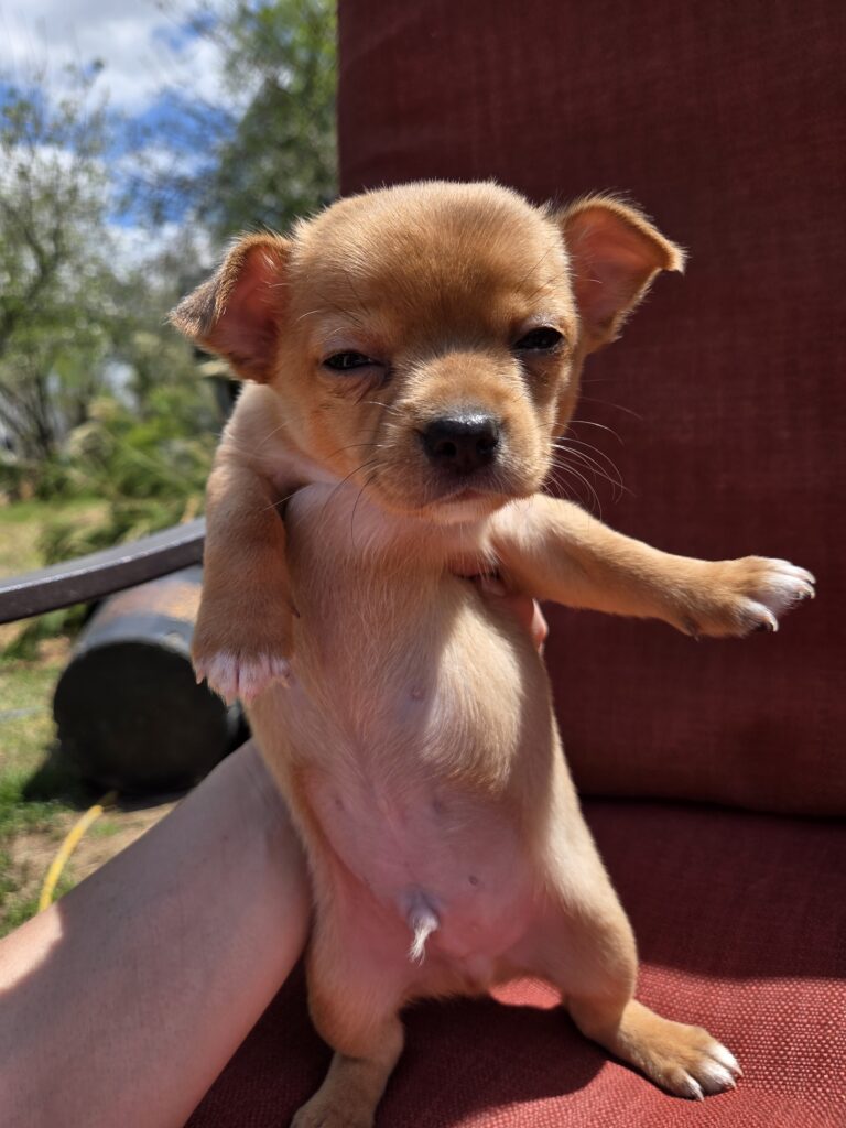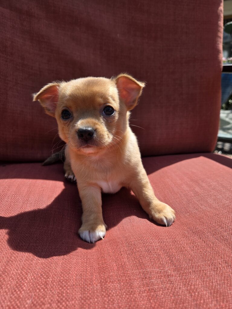 Male chihuahua from a litter of 5. He is light tan, with white paws and chest. He is so sweet and very socialized. He is full of curiosity and wonder. Mostly puppy pad trained! His dad is a registered long haired Merle, weighing 8lbs, and mom is a brown short haired, weighing 10lbs. They just had their first shots and dewormer today (4/3/26). A $200 deposit is required for any hold. Must pick up by their 8wk birthday (4/17/26)
