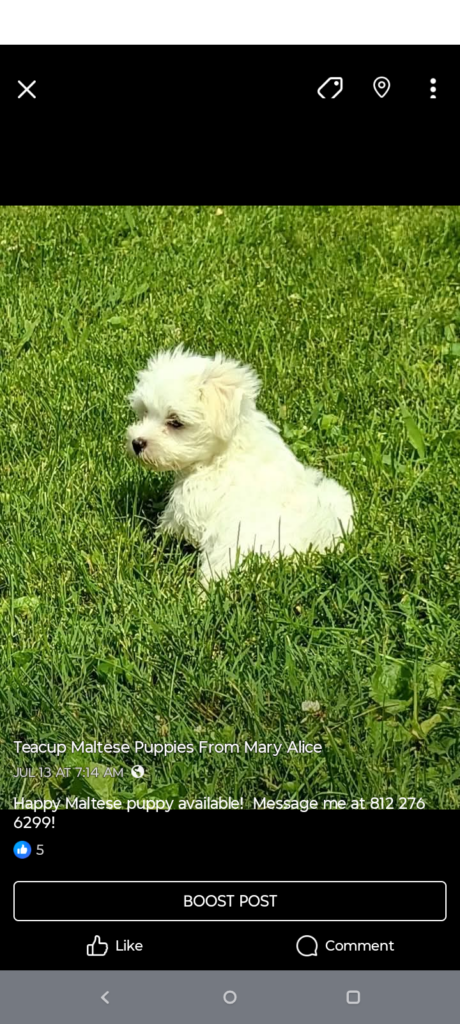 Adorable purebred Maltese puppies available for forever home! Males & females available. Puppies are friendly, loving and looking forward to seeing you! Call or text 812 276 6299