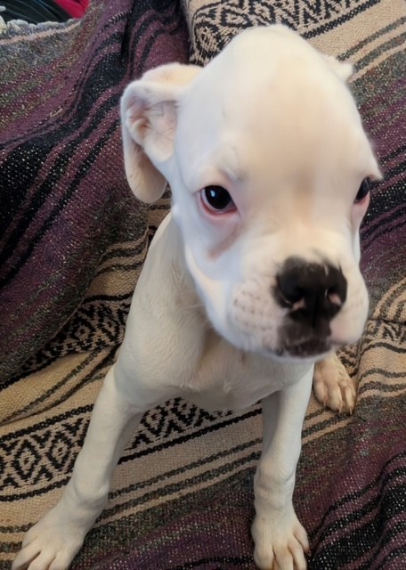 Zeus is the little runt of the litter, but has caught up pretty fast to his litter mates. He is all white with a tri colored ear that is black, white, brown striped. He is a little sweet guy and a bit shy. Don’t let that fool you though! When he wants to be heard he lets you know it! He loves to play with stuffies and his toys and will give you an occasion little kiss. His Tail is cropped and de Claw has been removed. He has been to the vet for a first check up and shots. He has been dewormed at 4, 6, 8 weeks. Contact Karen 443-676-6643
