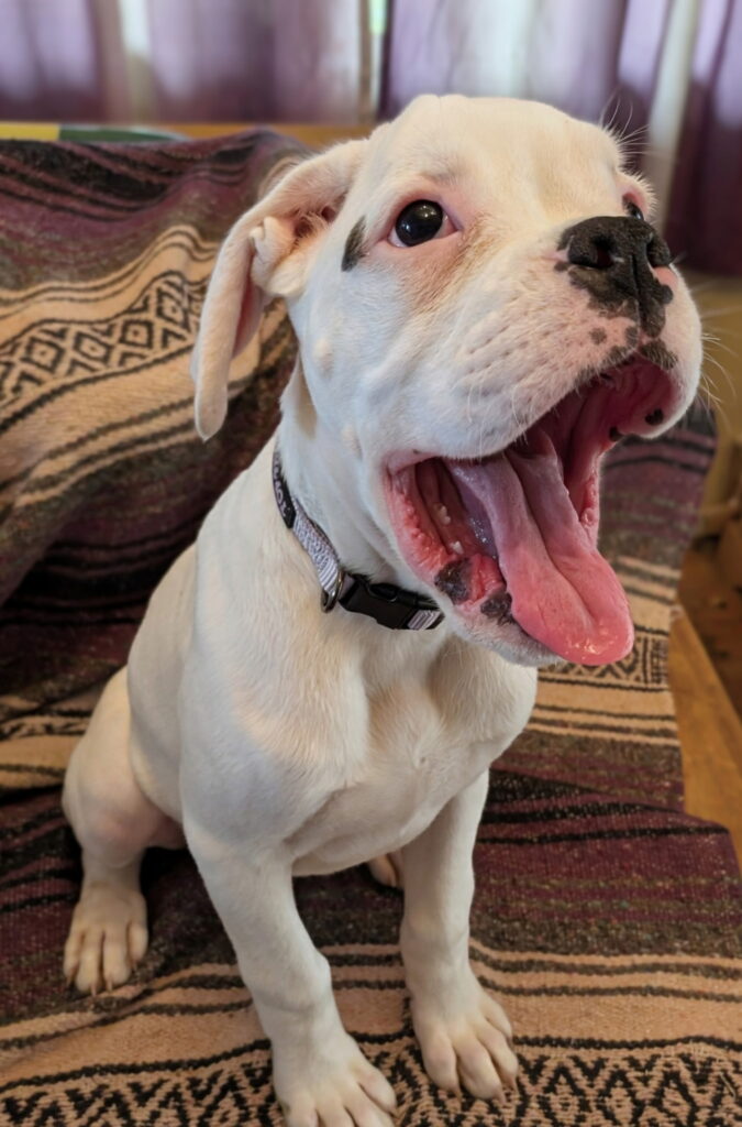 Meet Ghost! He is all white little guy with a black spot. He is such a chill little guy ,but likes to explore his environment. Ghost loves to say hello and give lots of kisses to greet his friends. He has long floppy ears. His Tail is cropped and de Claw has been removed. He has been to the vet for a first check up and shots. He has been dewormed at 4, 6, 8 weeks. Contact Karen 443-676-6643