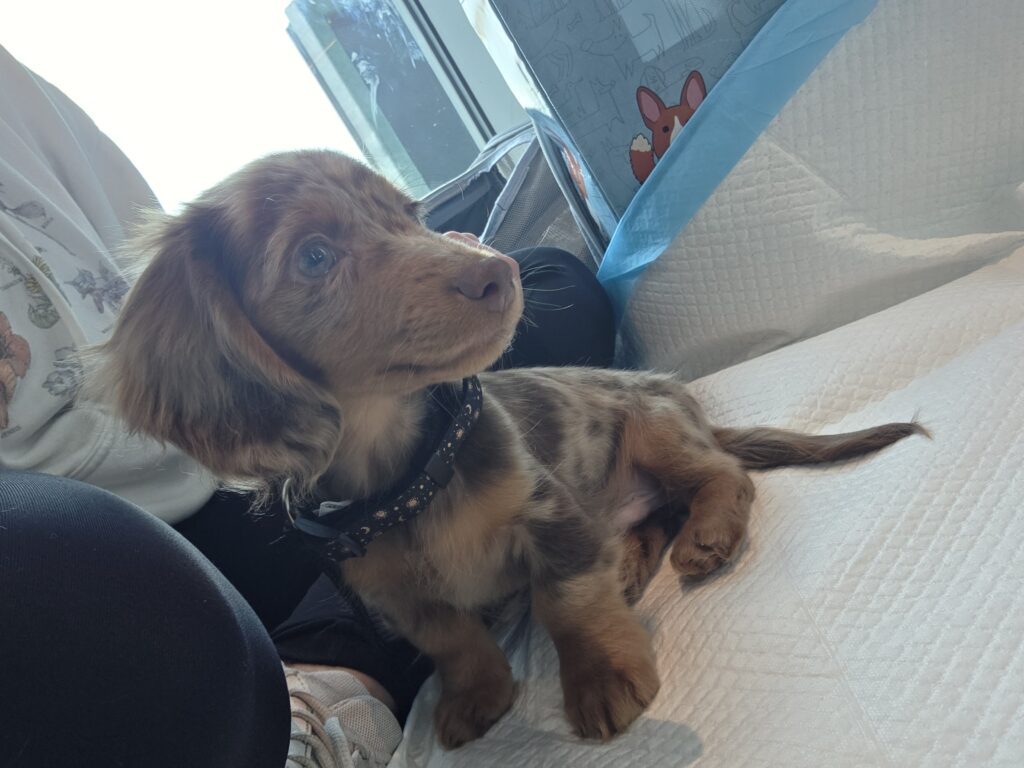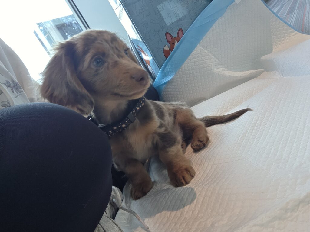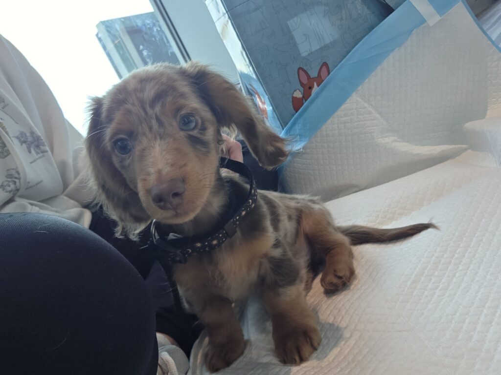 This gorgeous dapple Mini Dachshund is sure to capture hearts quickly. He deserves a loving family ready to give him all the cuddles he can handle!