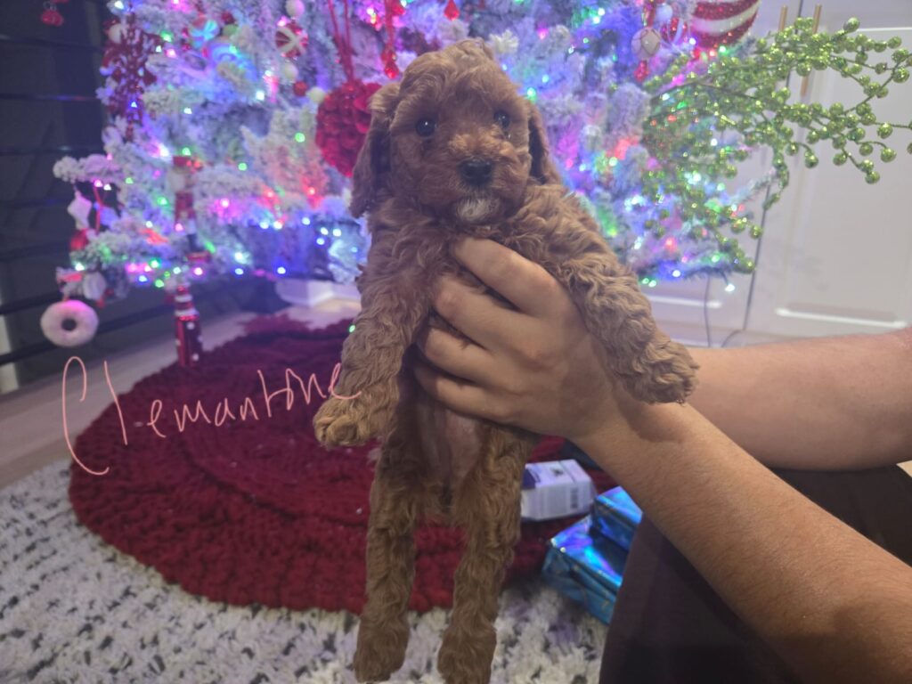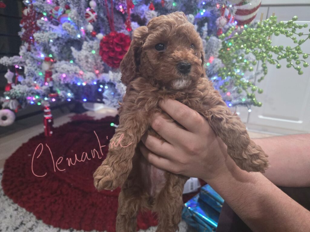 Clemantine, similar to her brother is the second biggest in her litter with a slightly lighter coat. She is a loving red golden doodle who is never in a rush but always makes it to her destination.