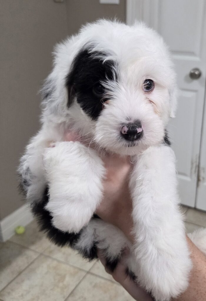 Cupid is a mico/mini sheepadoodle. Both mom and dad are family pets. Cupid is very sweet and loves people especially children. He loves being held, but is also very playful and curious. He gets along well with other pets.