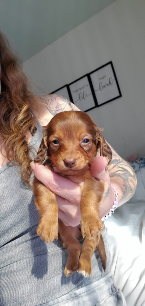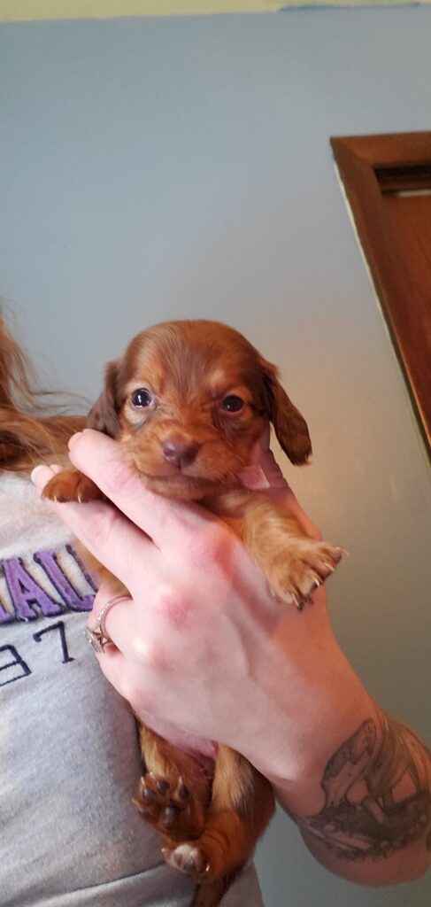 Lilly is a miniature daschund she’s super sweet and just so adorable she will be ready to go March 10th and will have first round of deworming and vaccines done at her 8 week appt. If you would like to come see the puppies in person reach out to me.