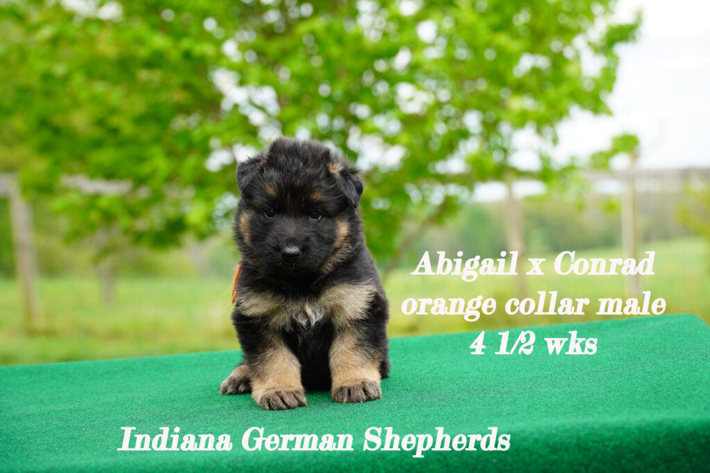 orange collar long coat male — If you are looking for a stunning black/red long coat puppy you have found it here! This is a repeat breeding due to how stunning they turned out the 1st time! The dam is Abigail von Schmidthof II and the sire is Conrad von Schmidthof. Pups were born 3/23 and will be ready for new homes approx. 5/18/25. We expect these pups to be a very nice mahagany red/black with gorgeous pigment, nice bone size, structure and excellent temperament! Pups will be vet checked and cleared, have 1st vaccinations and dewormed. Pups also come with full AKC registration and guarantee for hips and elbows for the 1st year. See our website to see the pedigree www.gsdpups4sale.com. Call 812-499-5257 with any questions or email IndianaGermanShepherds@gmail.com. I have a video on my website showing how the pups from the previous litter have turned out so you get an idea of what to expect. These pups have the potential of being excellent show/working/obedience prospects, potential service dog, search and rescue as well as could be an excellent addition to a breeding program. In addition, these pups should be excellent home/family protection prospects. If your looking for an excellent addition to your home check out these puppies.